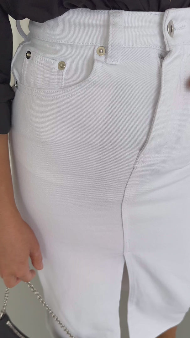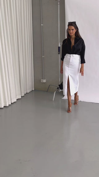 The Caplan Skirt is a high waist skirt with a split at the front. This skirt is made from a rigid denim with no stretch.