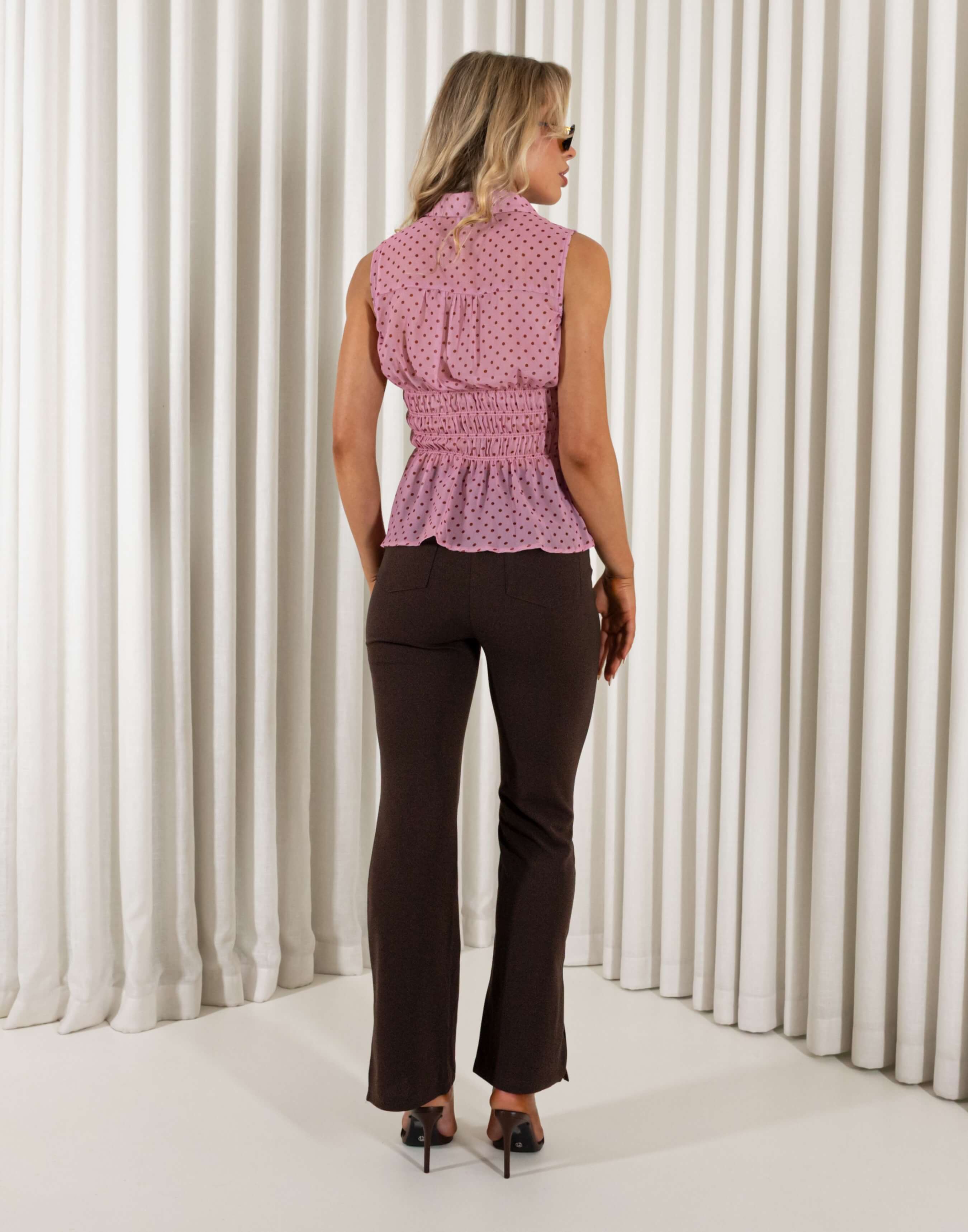 Different week, new formula. Cole in brown gives a high waist that lengthens the line and a neat, tailored cut that sits right all day. For a dressy take, pair with the Penny polka dot top, the Erika handbag and heels. For daytime, switch to wedges, throw on the Alex oversized shirt and the Omar sunglasses in orange. Dressy or laid back, the fit holds up.