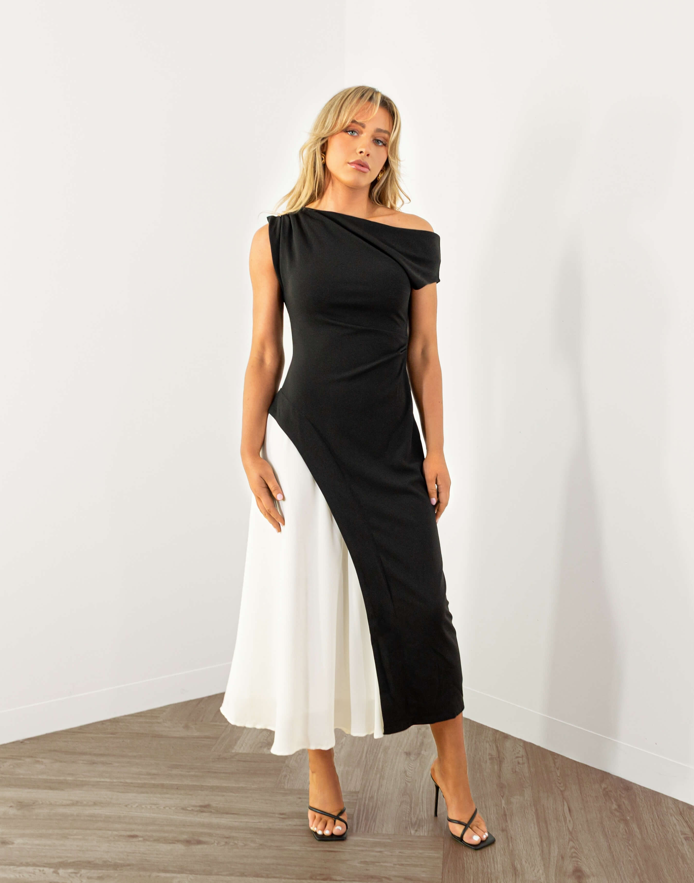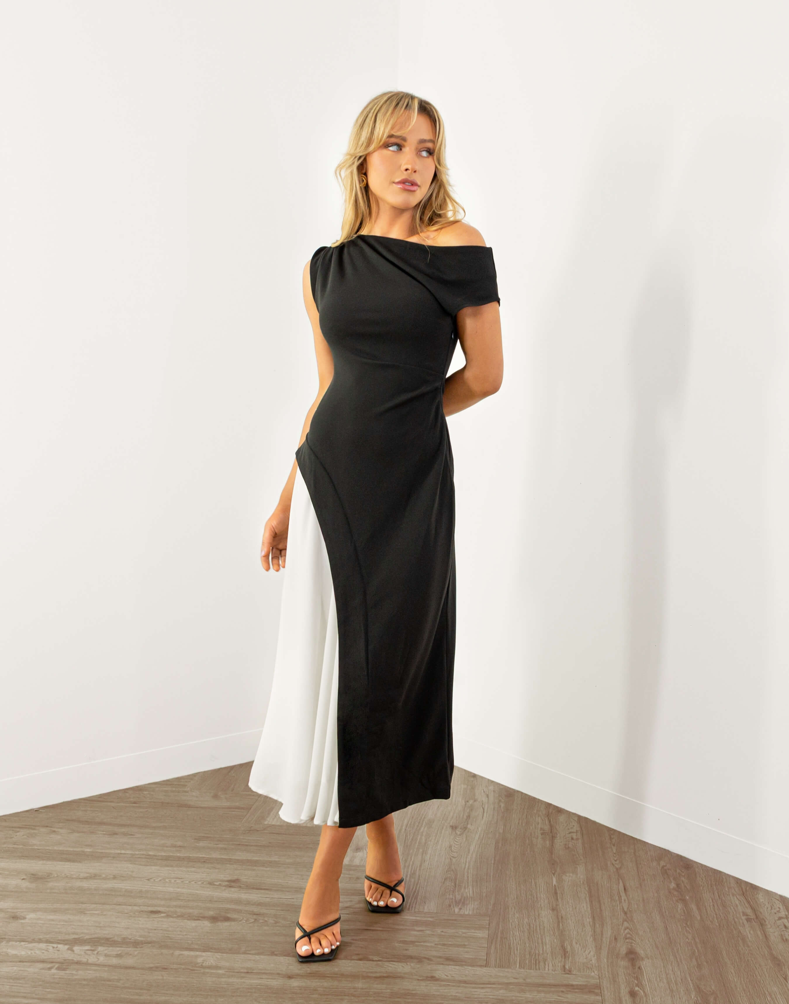 Made for big moments, Gavin is your sleek event dress with impact. The two tone contrast and asymmetrical cut sculpt the line, while stretch fabric moves with you. True to size and cut off the shoulder with gathered detailing, it balances polish with ease. Style with pointed heels and a small clutch to let the contrast do the talking. Finished with a side zip for a clean fit, fully lined for comfort, and bra friendly when paired with the right strapless style.
