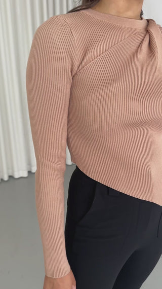 The Doric Top is a fitted, long crop top with a high round neck and long fitted sleeves. It has an asymmetrical neckline and stretch throughout.