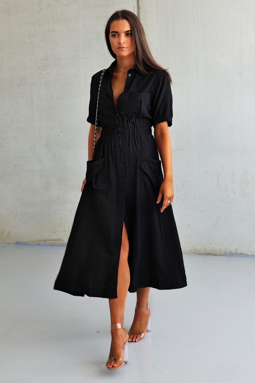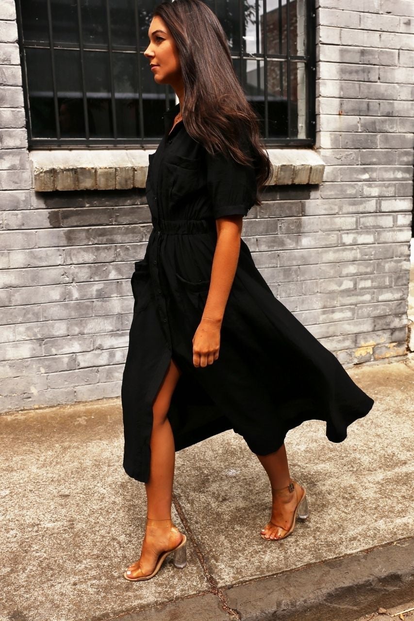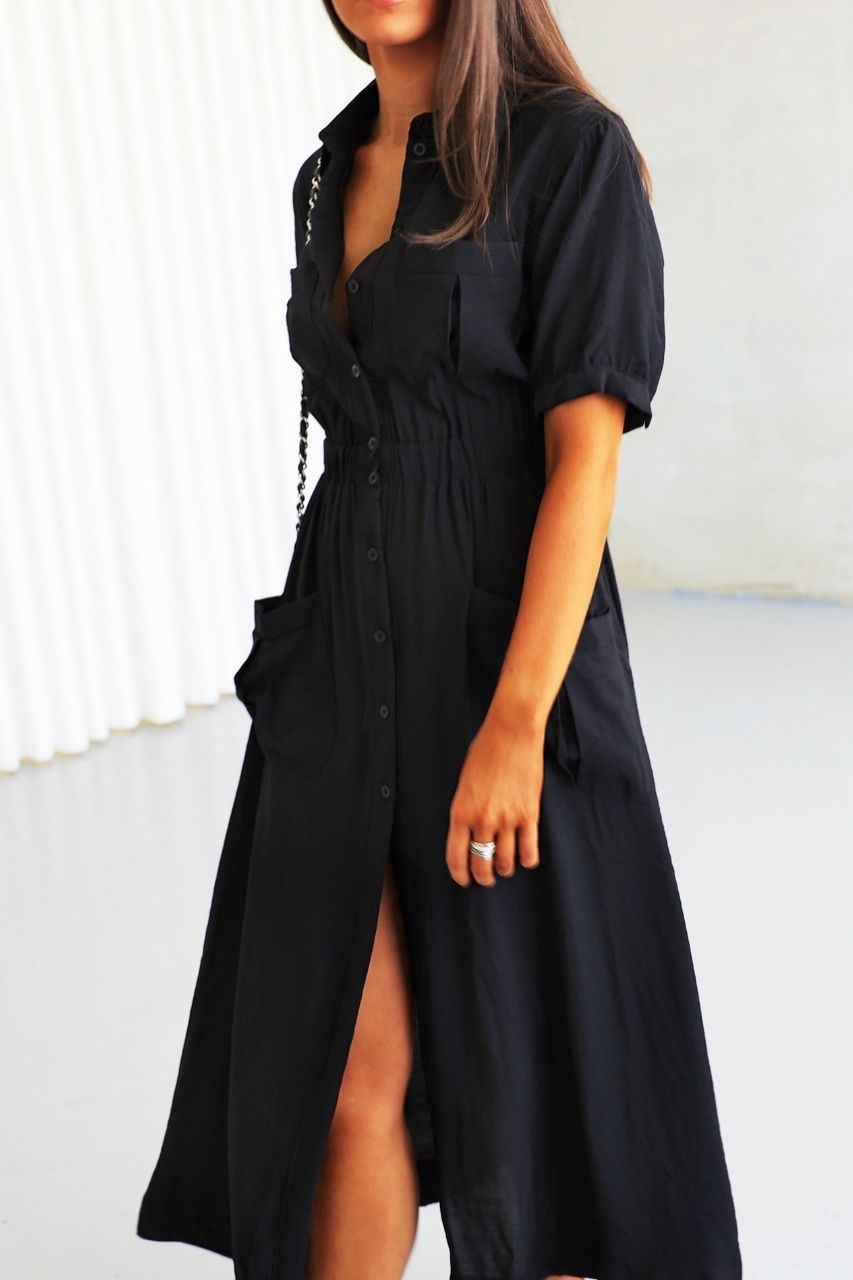 The Gracie dress is a shirt dress in a midi length with short sleeves. It has a thick elasticised waistline and two large front pockets on the bust and hips. The button down stops at the thighs so it splits open for a flirty fun look this summer.