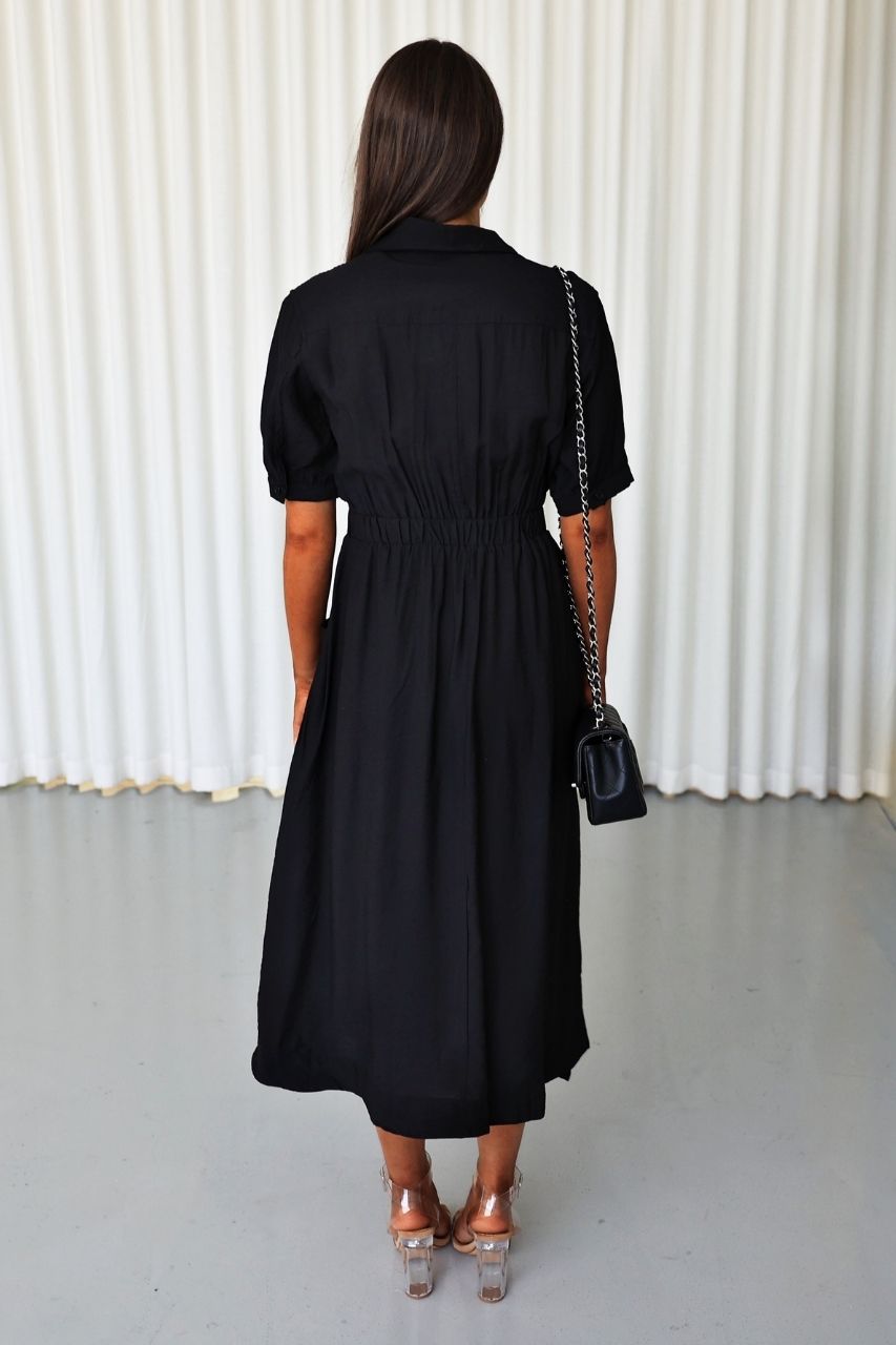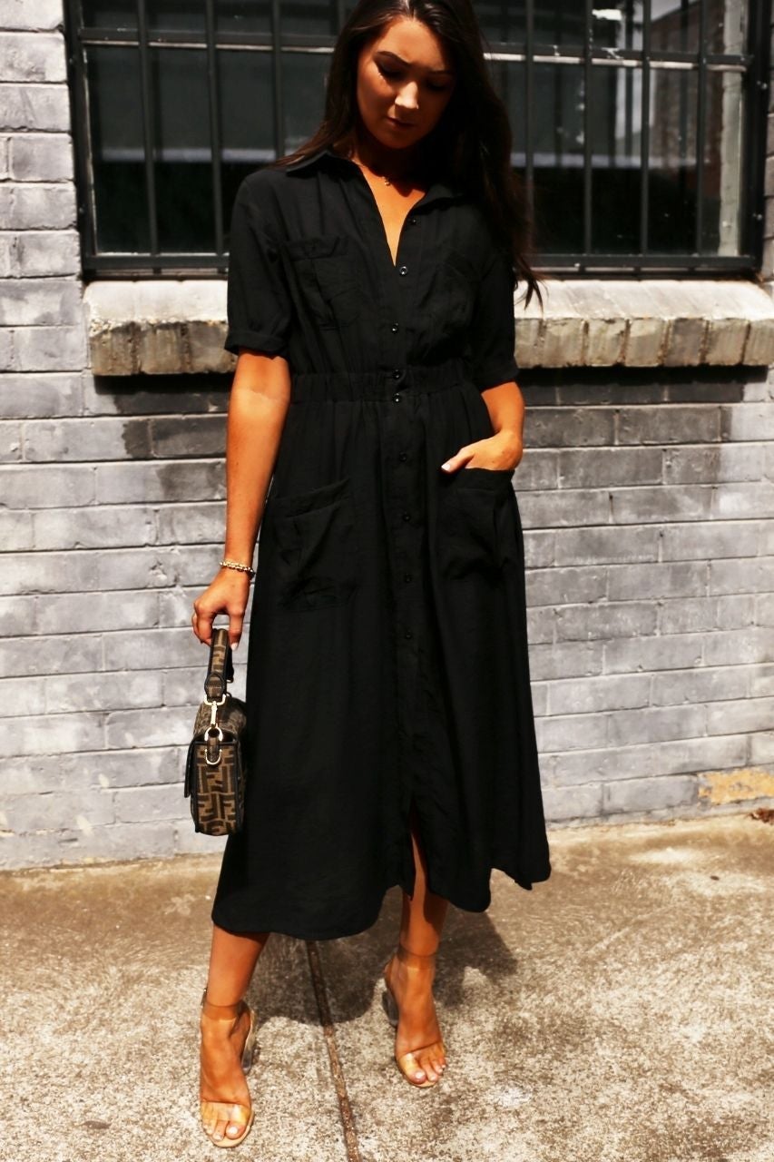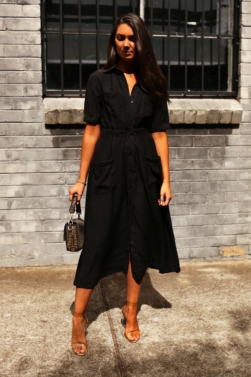 The Gracie dress is a shirt dress in a midi length with short sleeves. It has a thick elasticised waistline and two large front pockets on the bust and hips. The button down stops at the thighs so it splits open for a flirty fun look this summer.