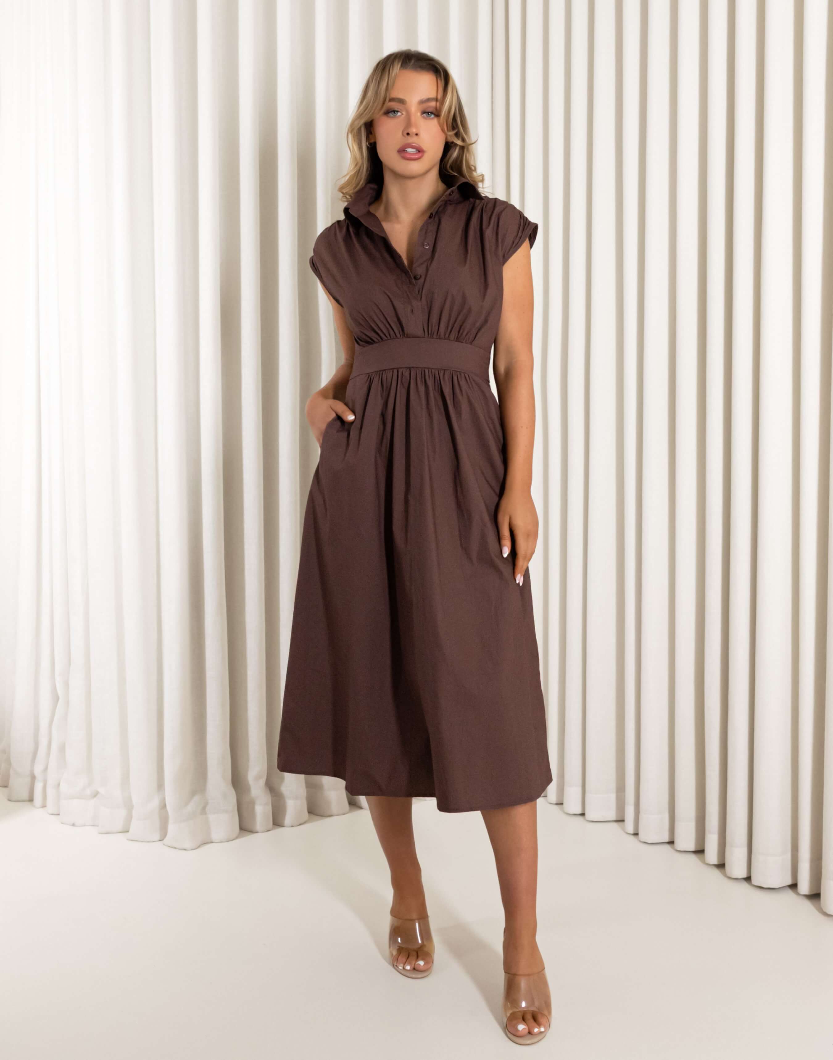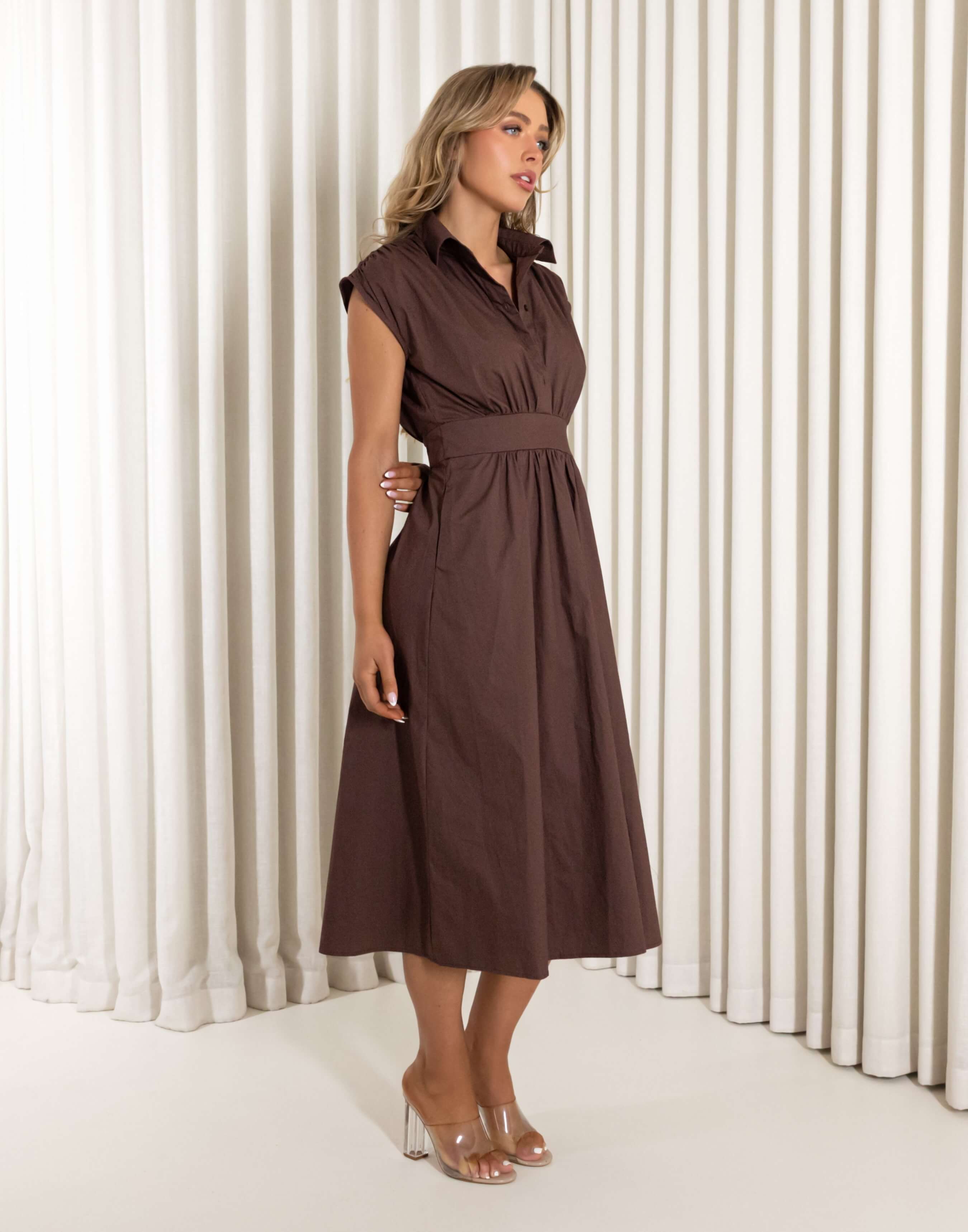 Feel like taking a winery tour or have day events that calls for a polished look, the Mira midi dress brings refined ease without trying. Crafted from breathable 100% cotton, it frames the body with a collared neckline, five button front to the waist and soft gathers that fall cleanly. Lean into spring summer with heeled sandals and a straw clutch, or add statement earrings and sunglasses for a garden party finish.