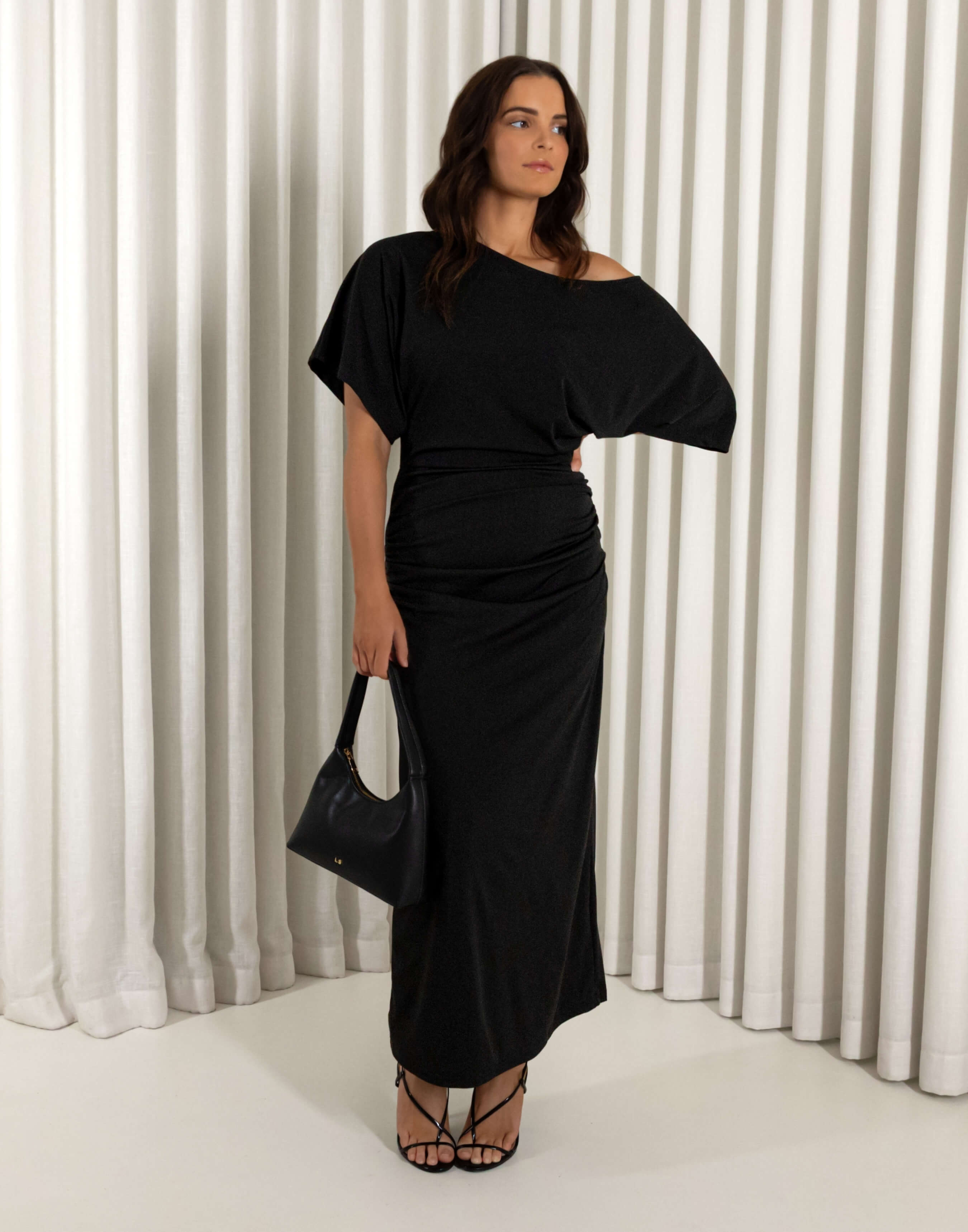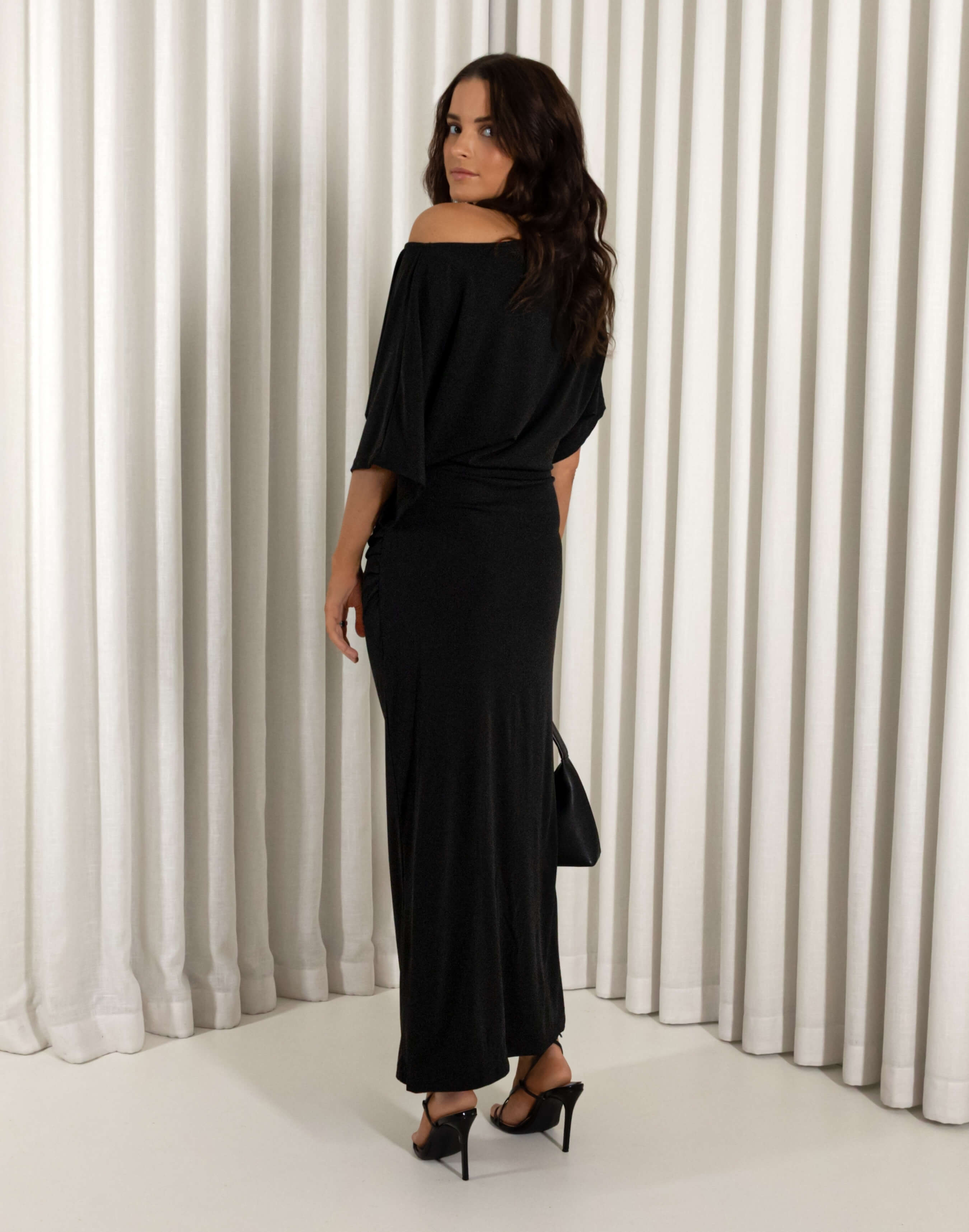- Off shoulder, short sleeve midi dress with gathering through bodice