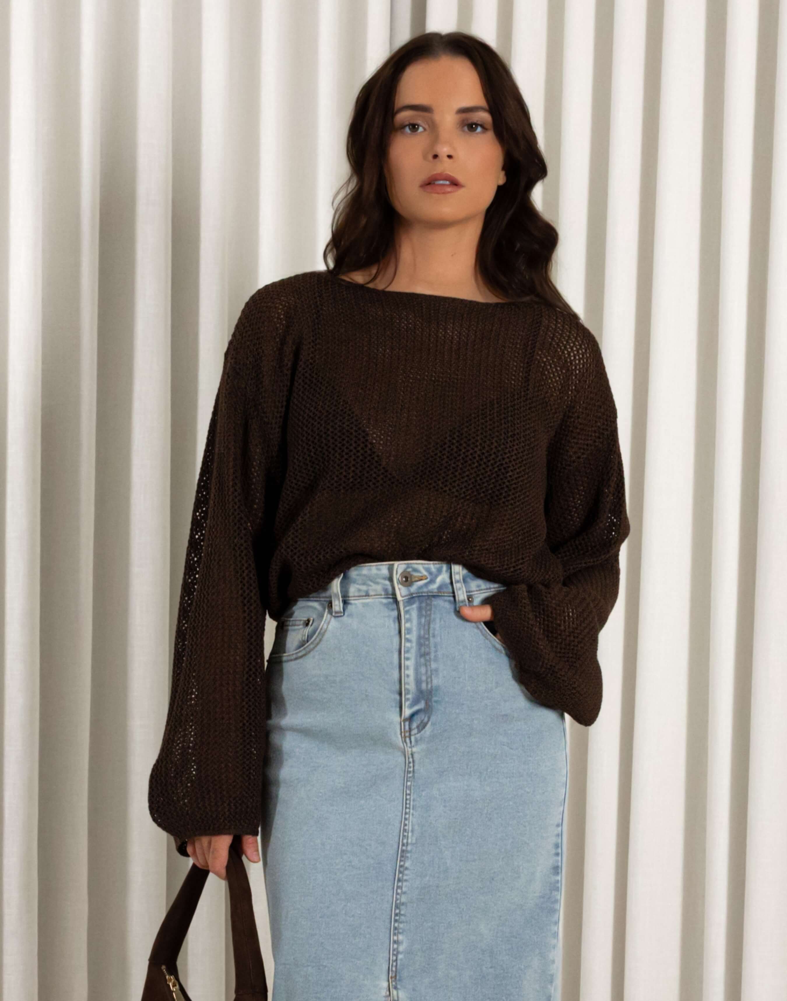 - Knit top with open weave and long sleeves