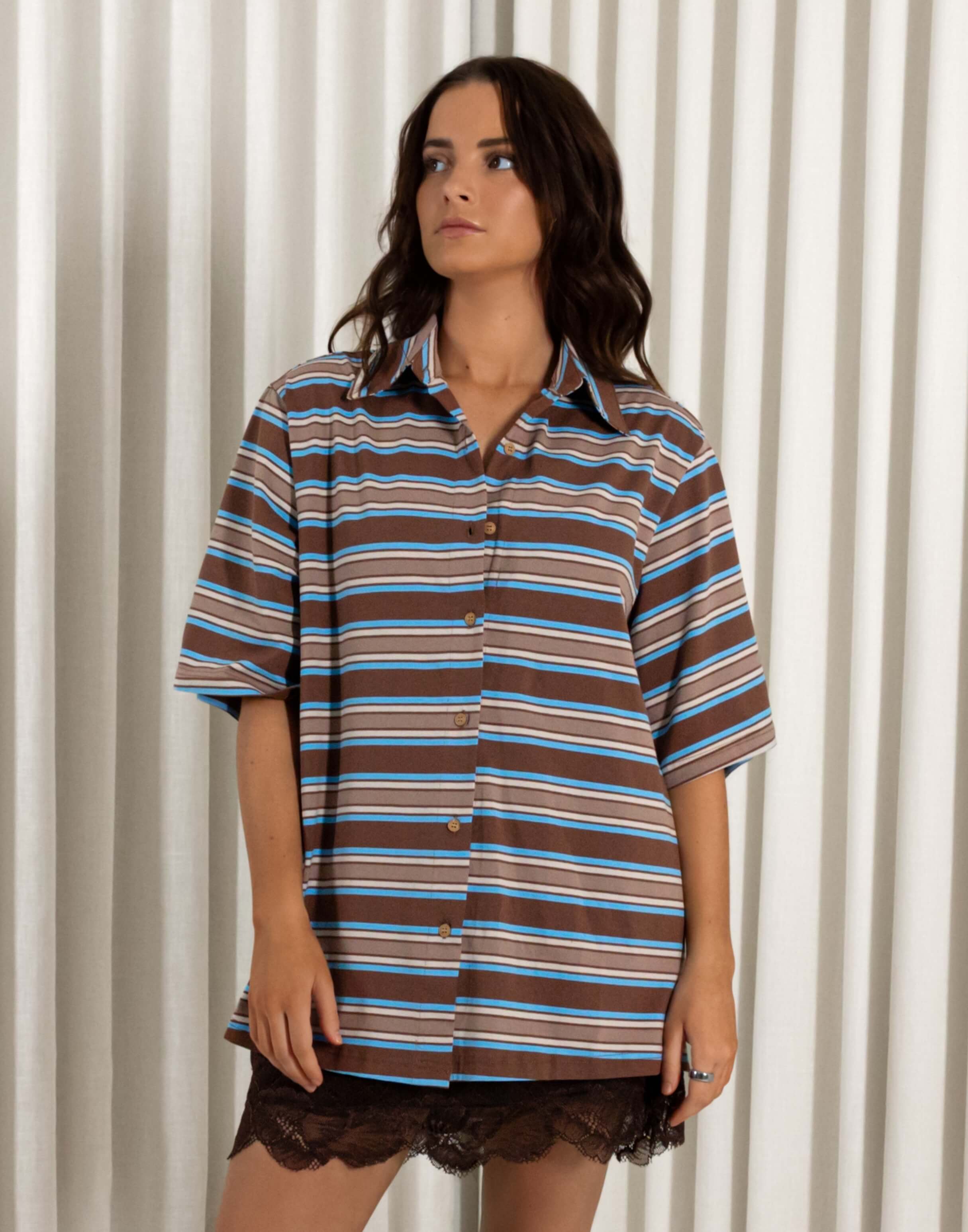 - Boxy cut, button down top with dropped shoulders and short sleeves