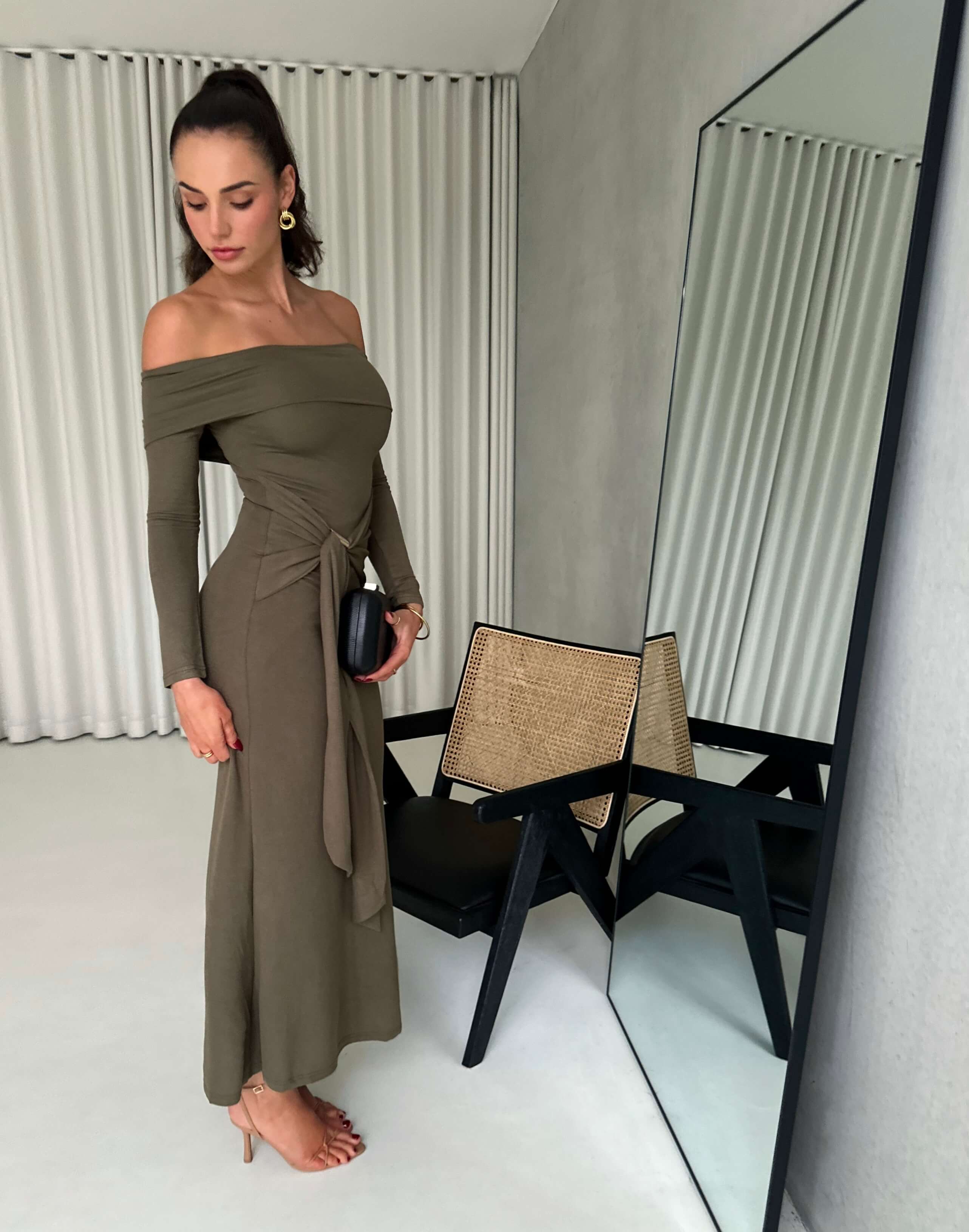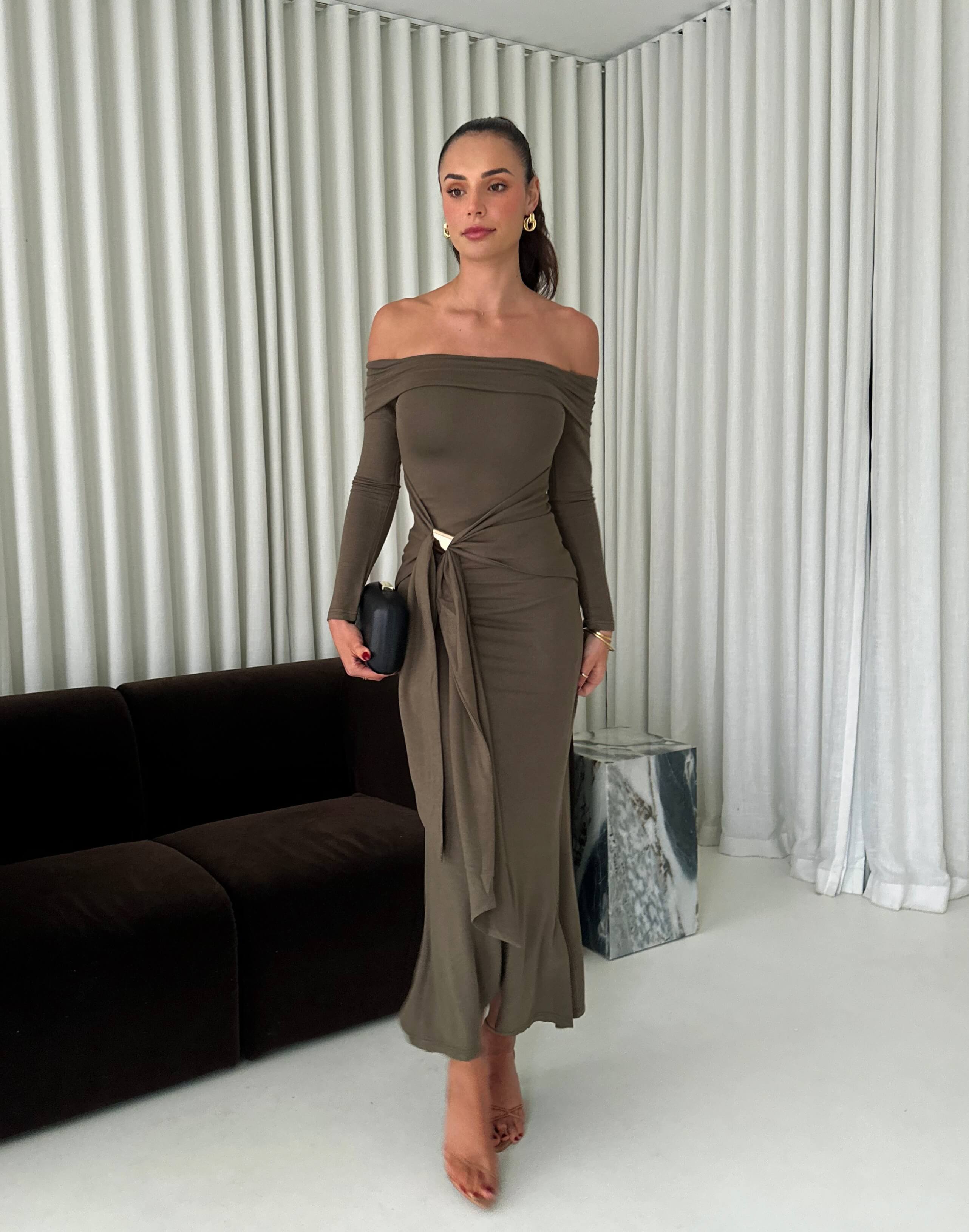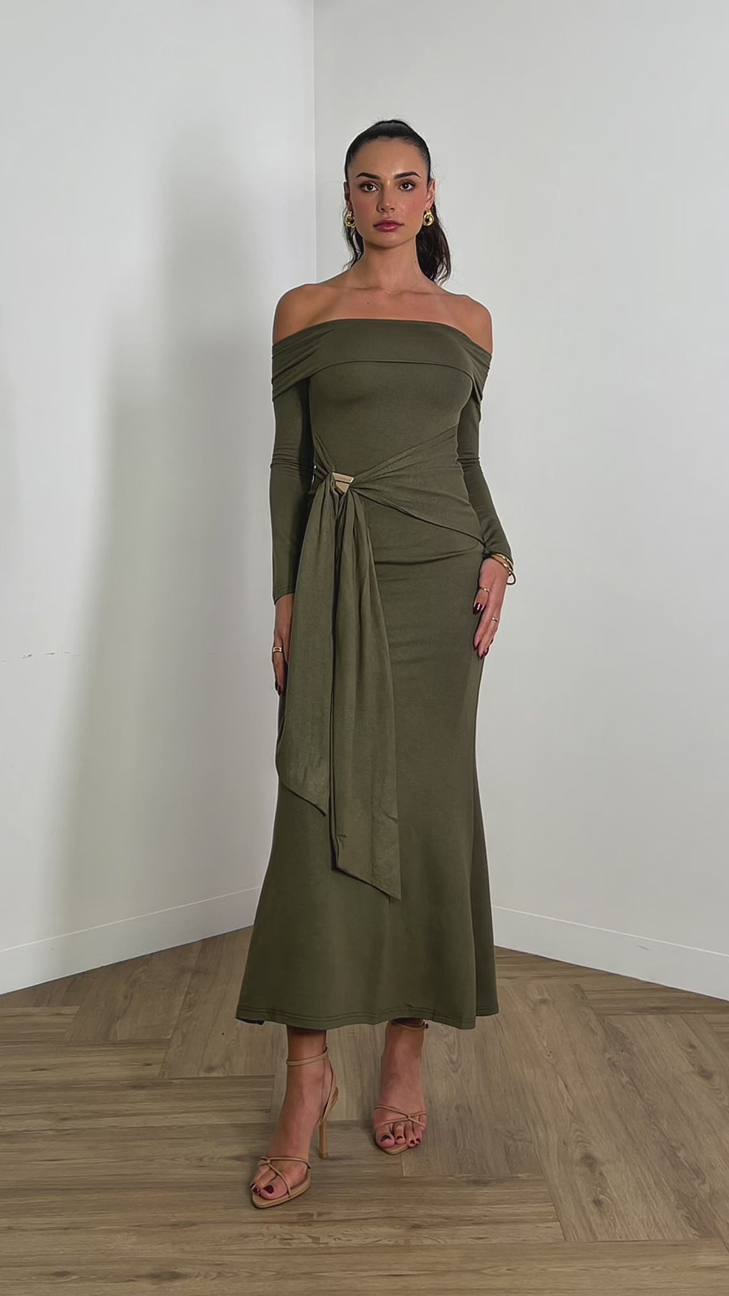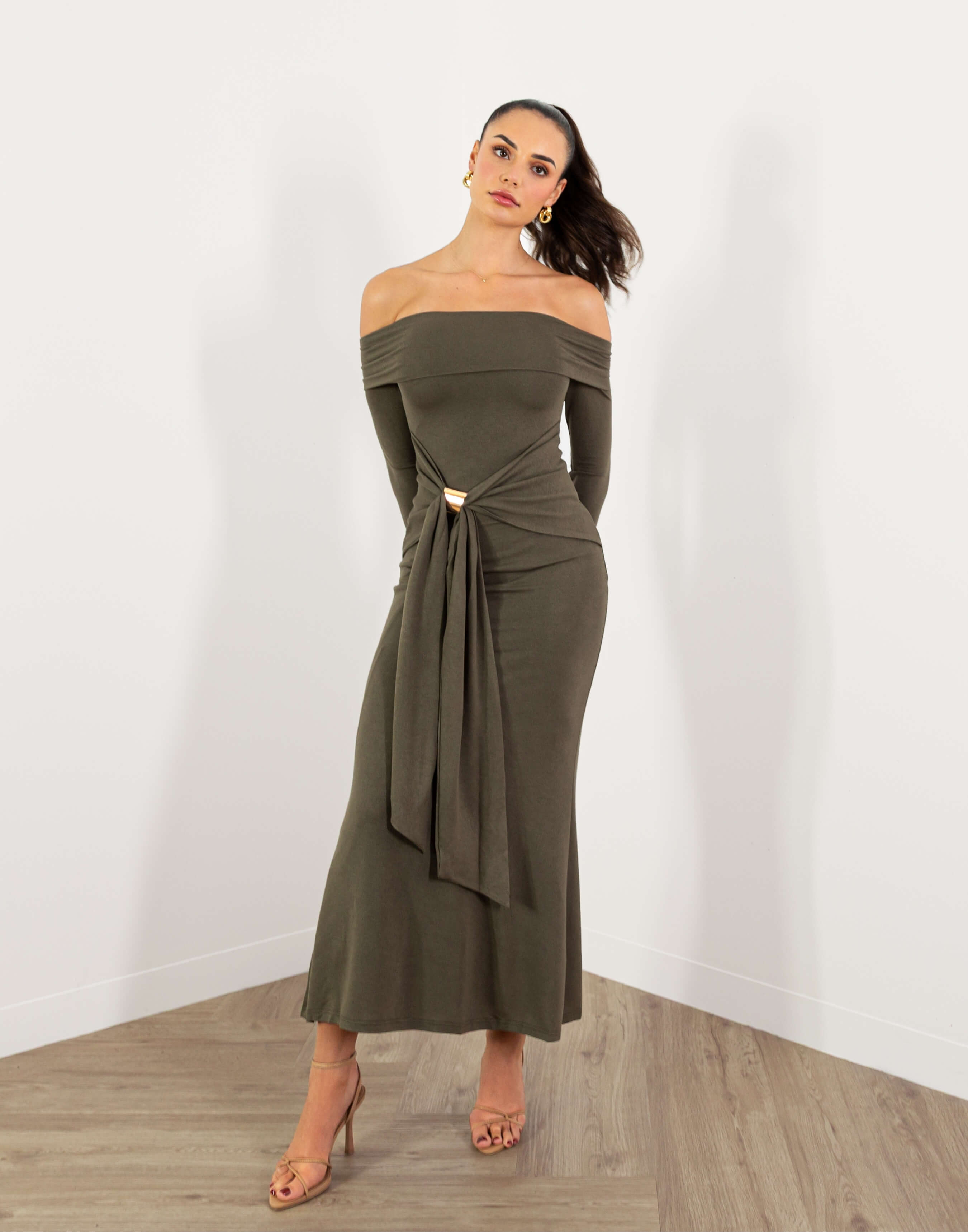 Nigel Dress - Off Shoulder Long Sleeve Midi - Olive
