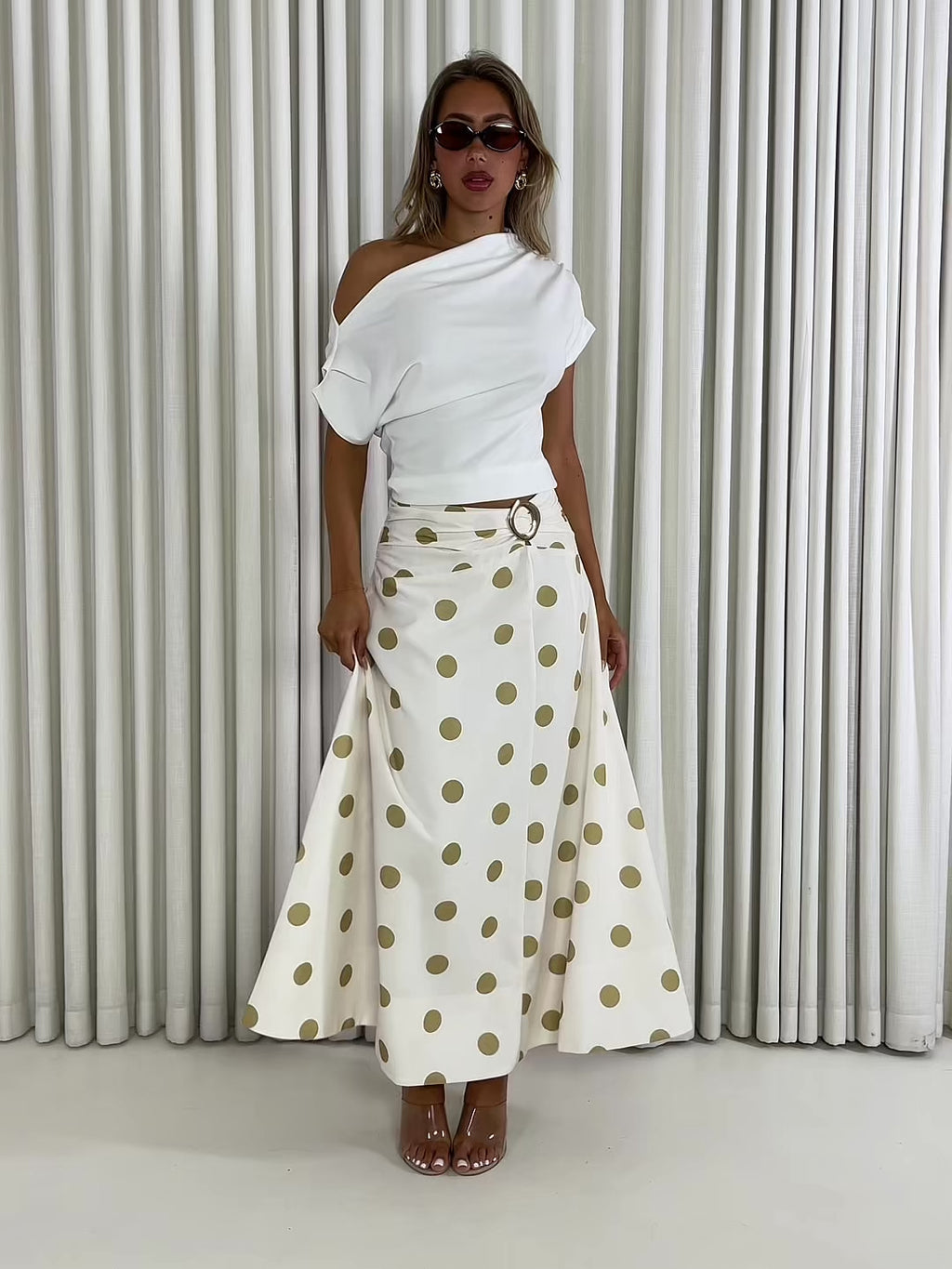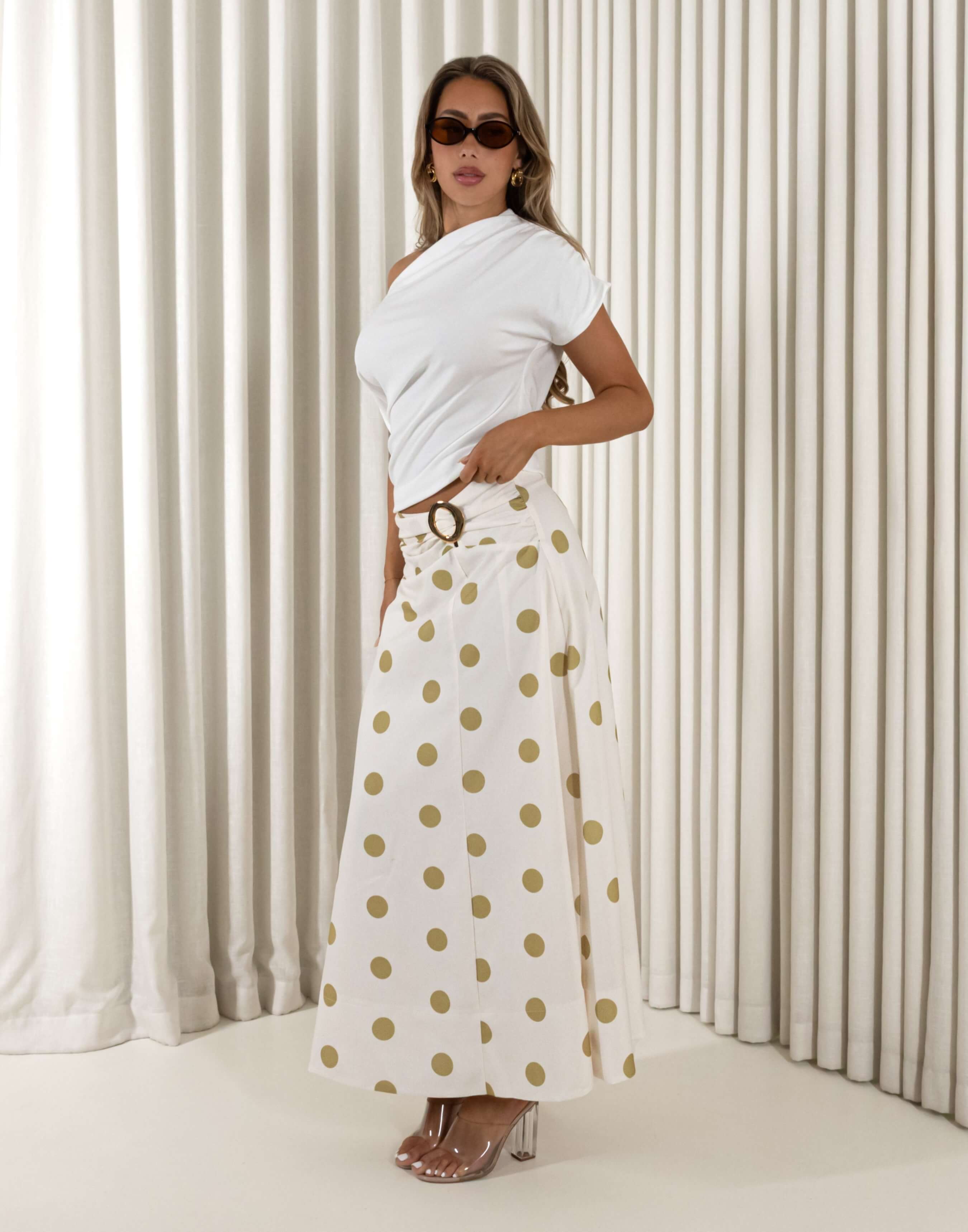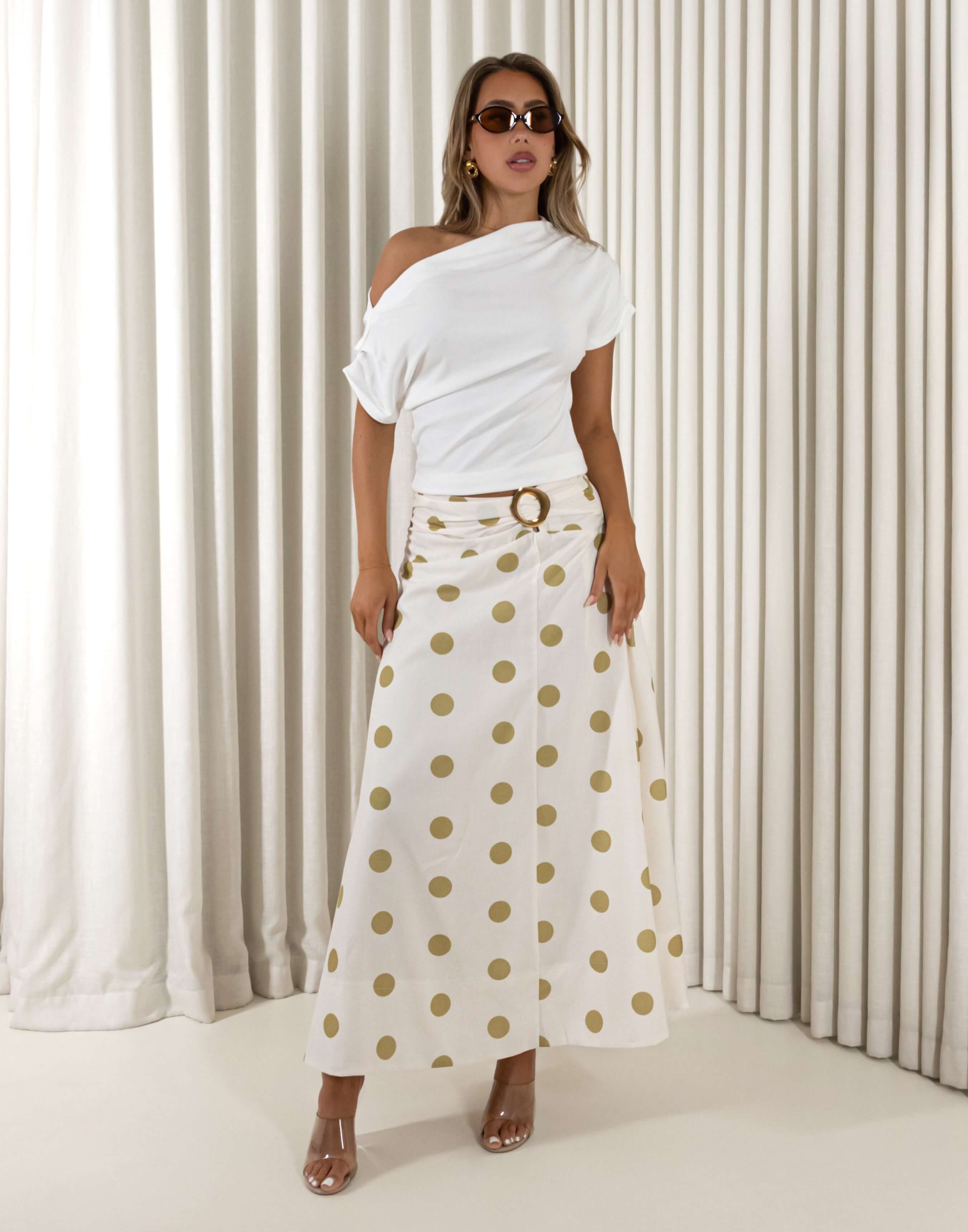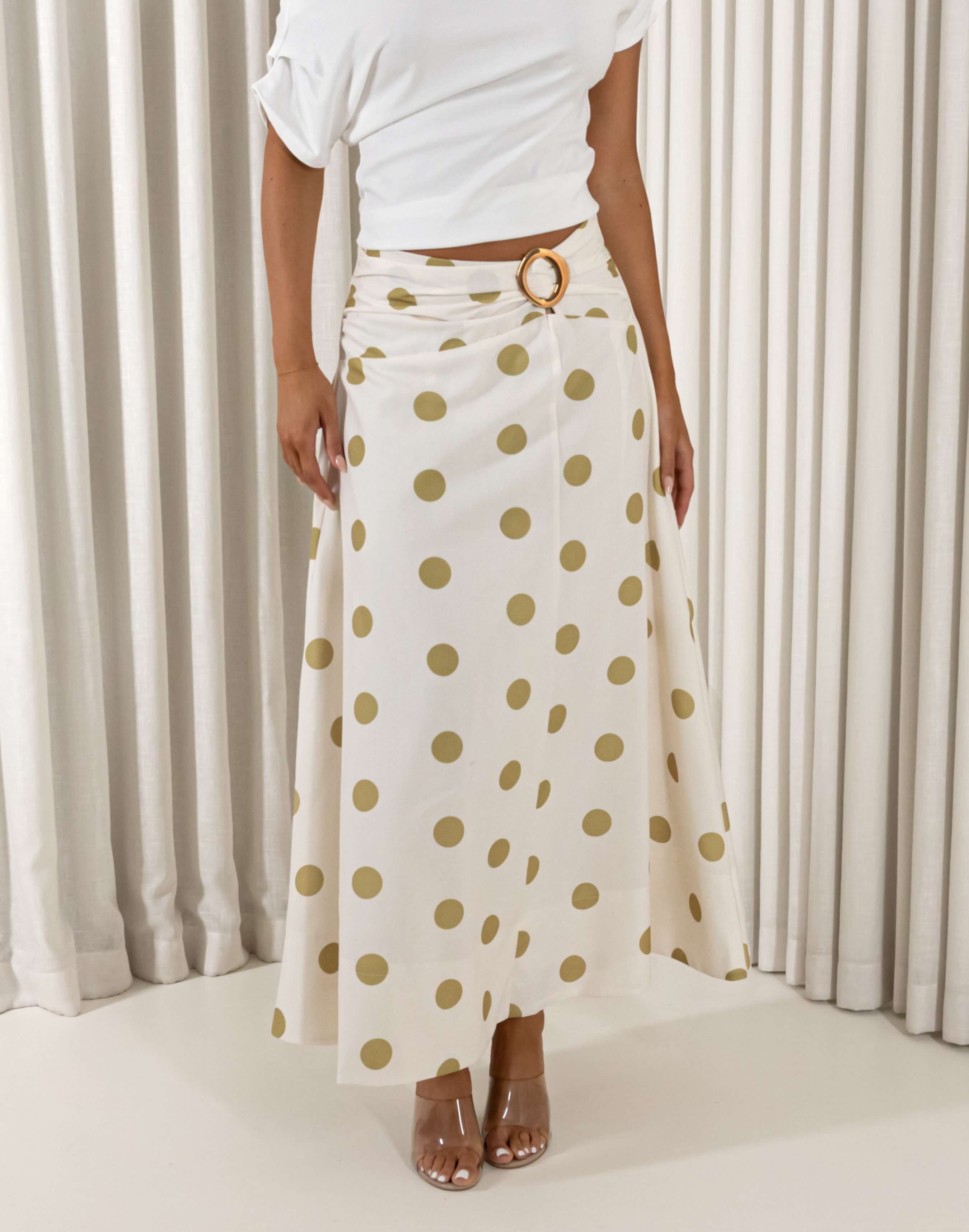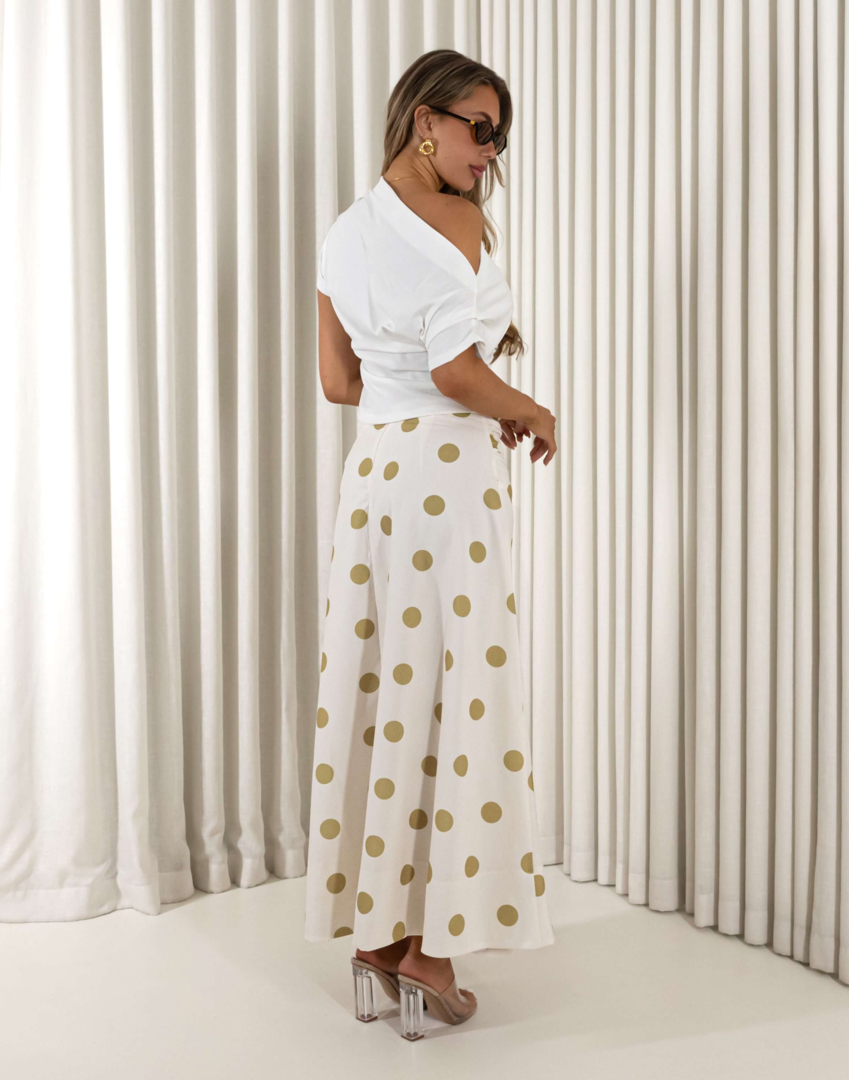 Do you want a piece that can be worn dressed up or down? The Vanessa skirt answers in cream polka dots with a quiet flash of gold at the waist, landing cute for brunch and long lunches. Pair it back with the Nicole top in white for crisp contrast, then add flat mules and a slim shoulder bag. When plans drift to sunset drinks add gold accessories, heels and let the dots do the talking. It keeps the mood light, moves beautifully, and plays nicely with everything from simple tanks to dressier tops.
