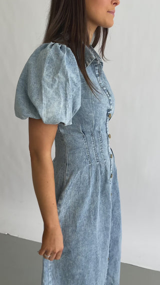 The Marie Dress has a collared neckline and short puff sleeves. It has some functioning buttons at the top and then a faux button down the rest of the front.