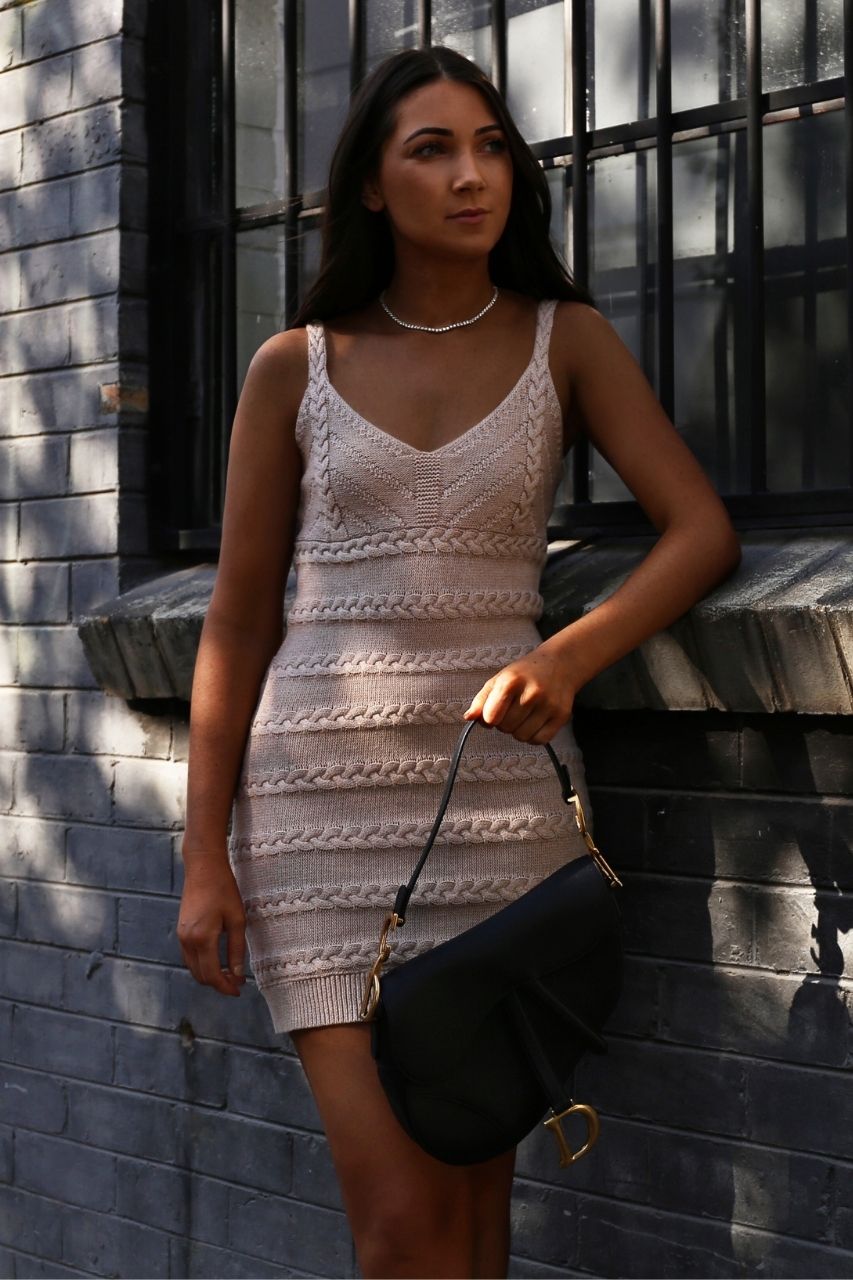 Keep knit simple. Our Dukes Mini Dress features a mini length, a V-neckline, spaghetti straps, a stretchy knit fabric with braid detailing throughout the garment and no lining