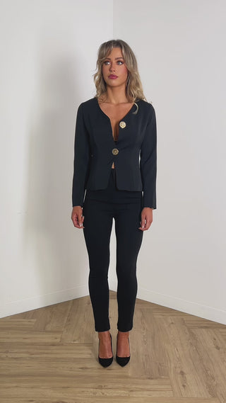 • Two Statement Button Close: Designed with two bold statement buttons at the front, offering a polished finish and enhancing the blazer’s tailored aesthetic.