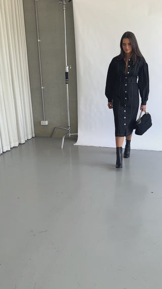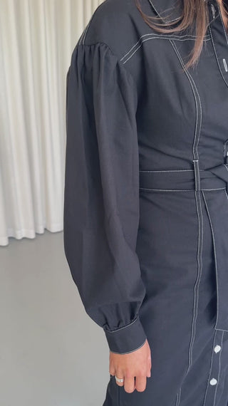The Lyman Dress has a collared neckline. It has a button-down front, drop shoulder and long puff sleeves with a one-button cuff close. It has a slit at the back and a removable waist belt.