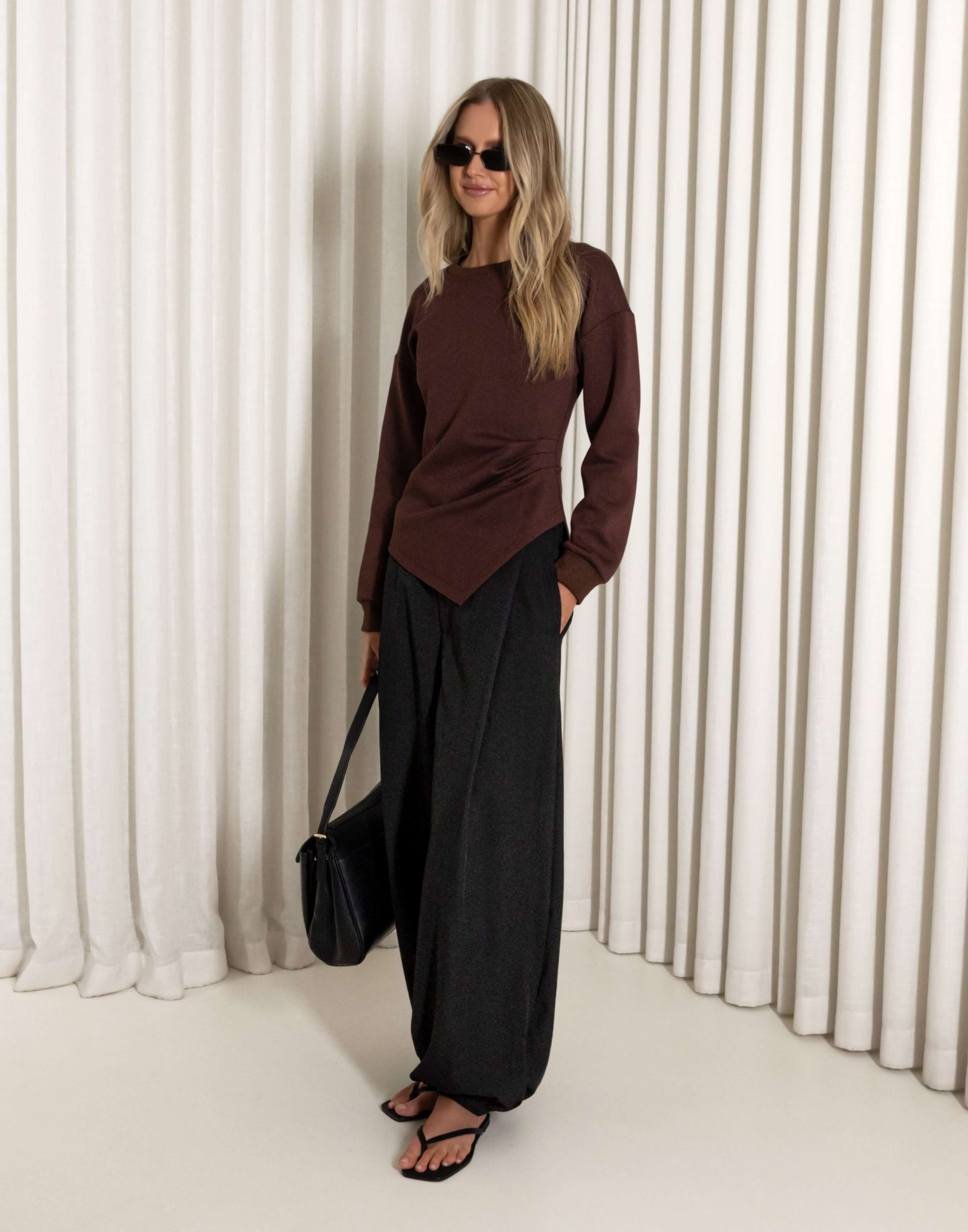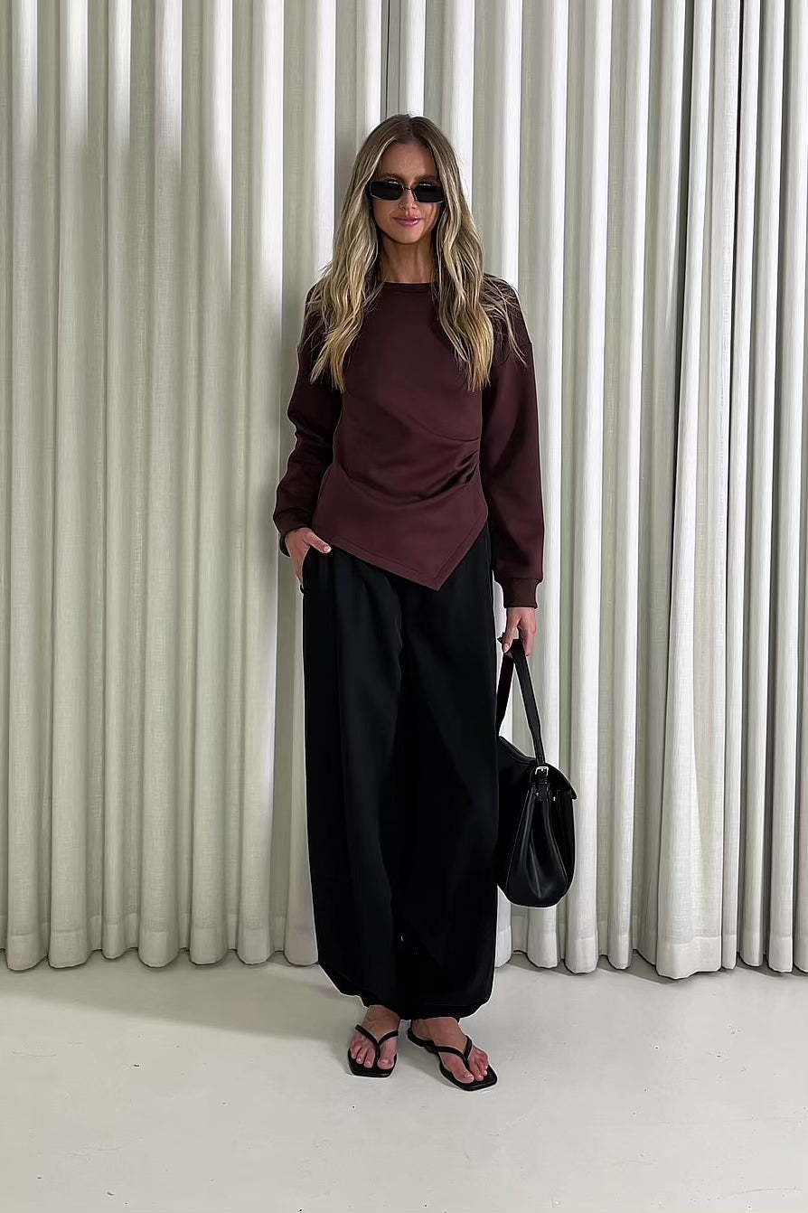 This is one of those tops that quietly does the work when you don’t want to overthink getting dressed. The Clayton in brown has that asymmetrical hem and gathered side detail, so it feels a bit more interesting without needing anything extra. It’s an easy option for days that need something a little nicer, whether you’re heading into the office or out later. The soft stretch fabric and long sleeves keep it comfortable while still feeling put together.