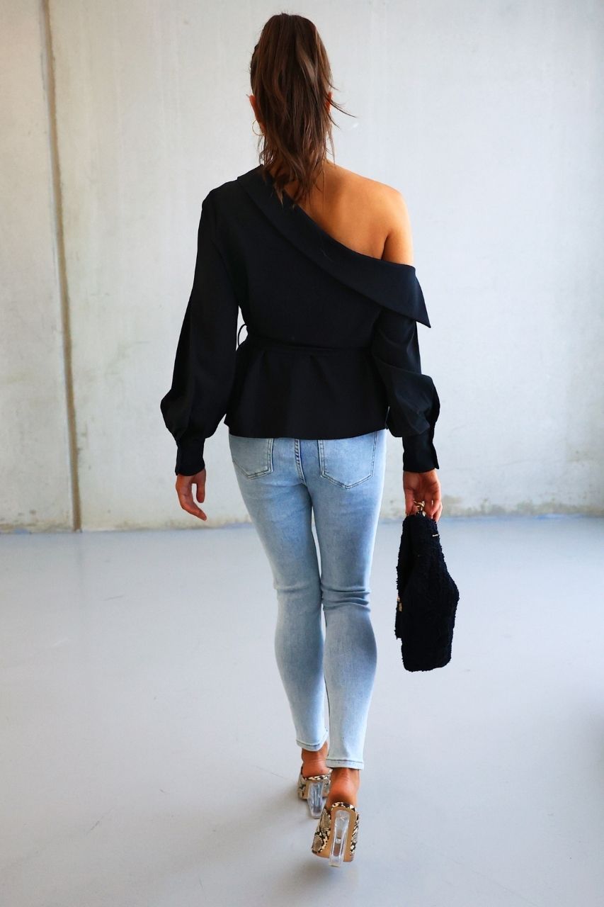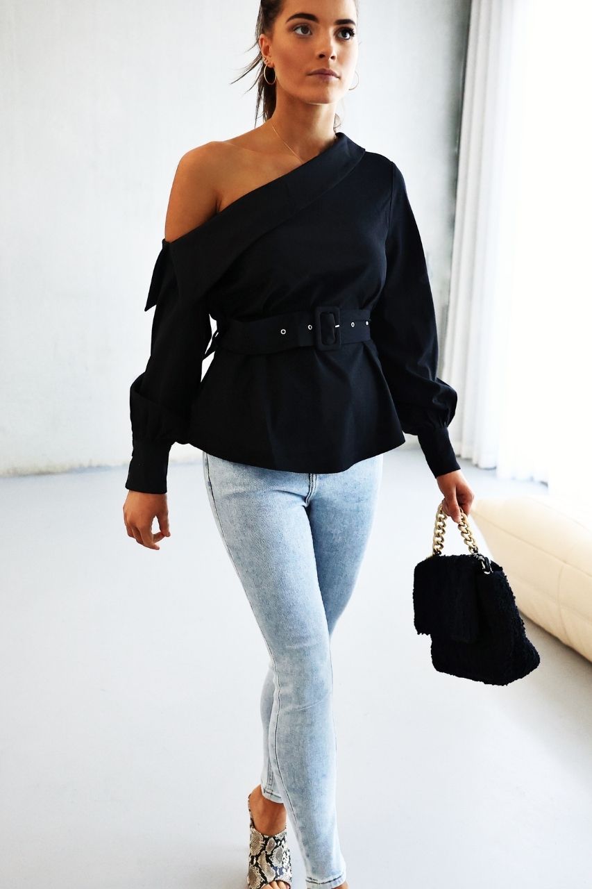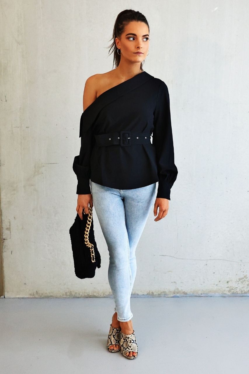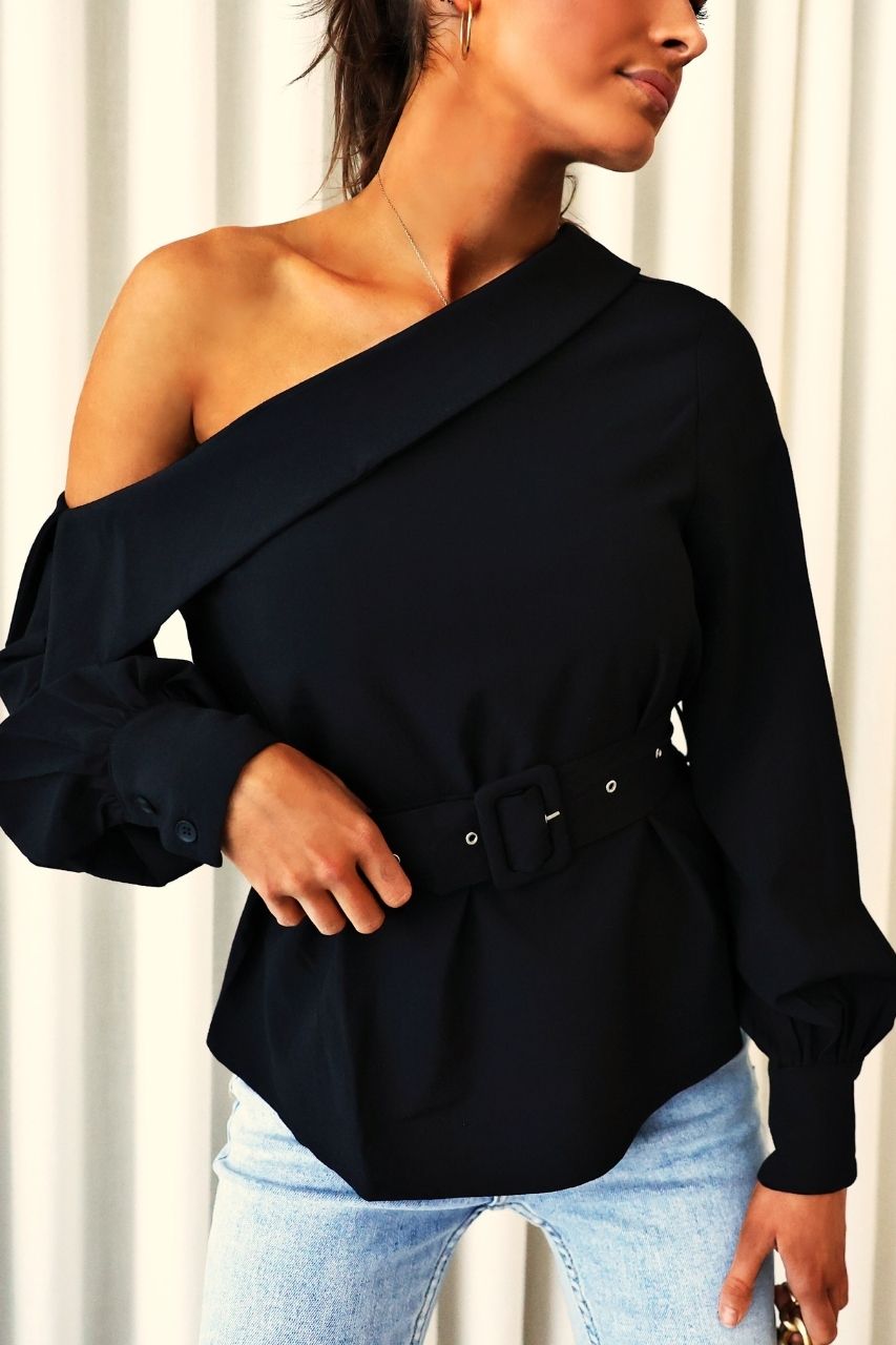 The Shaffer Top is an off-shoulder, long sleeve top with balloon sleeves and a two-button cuff. It has a removable belt. No zip.