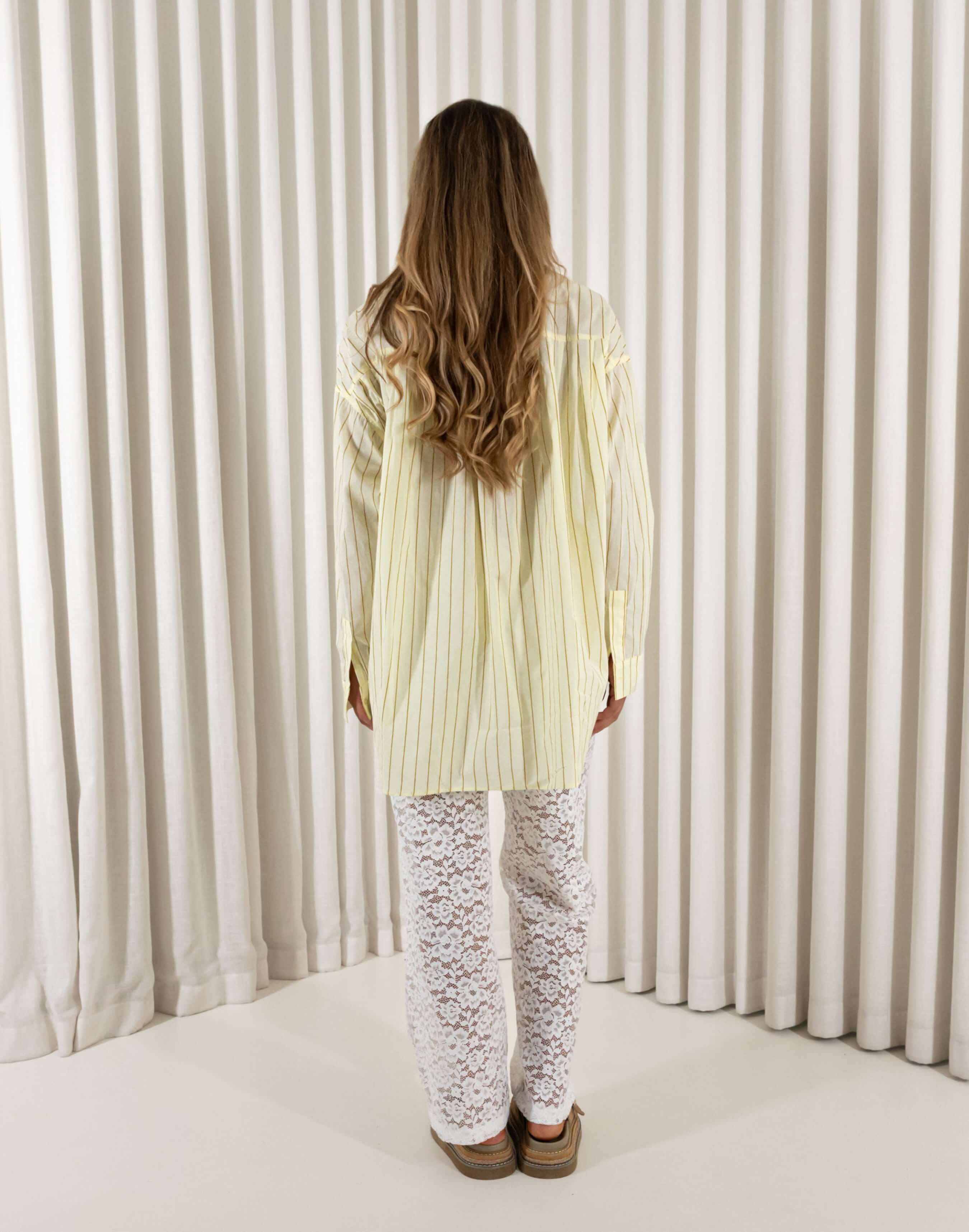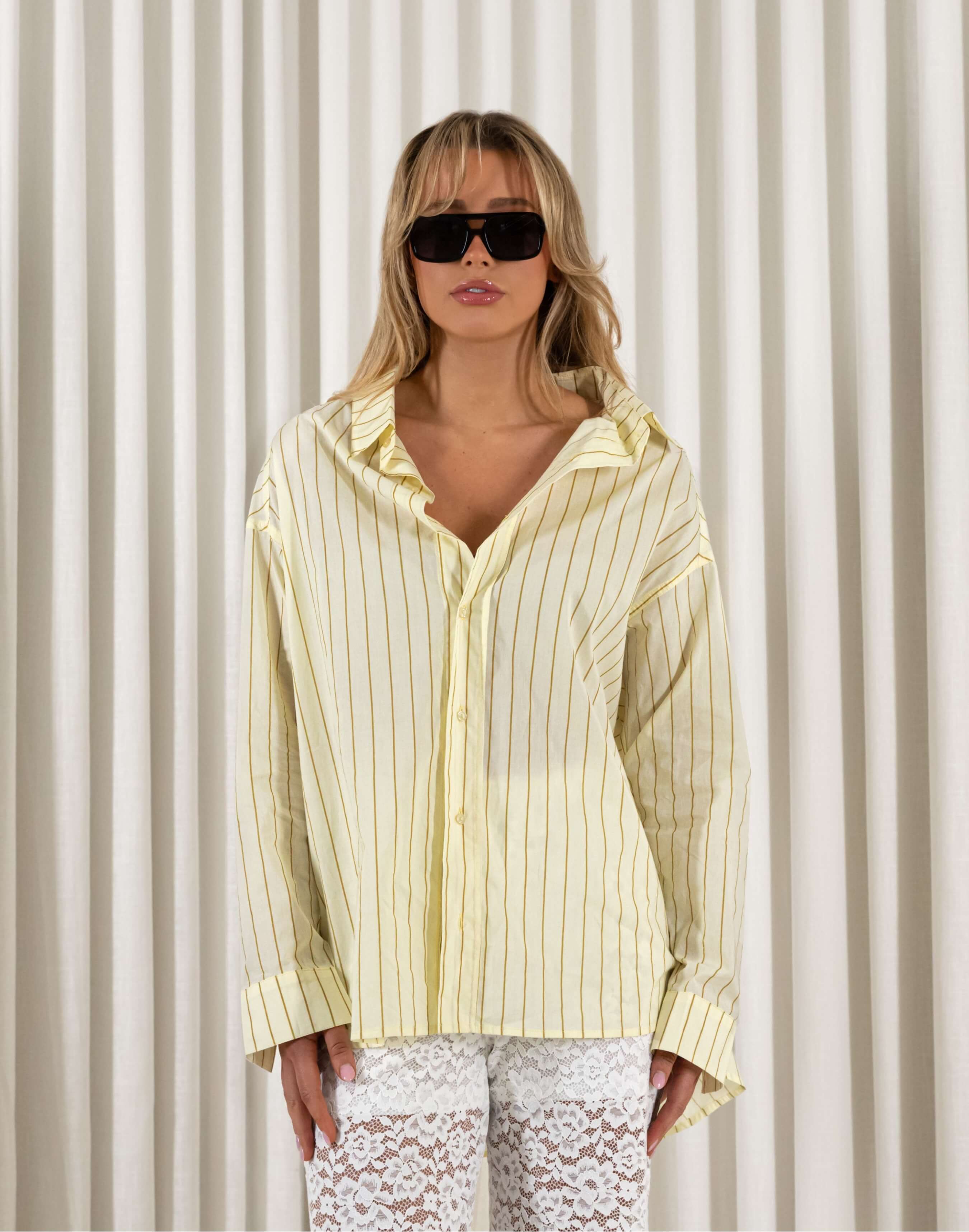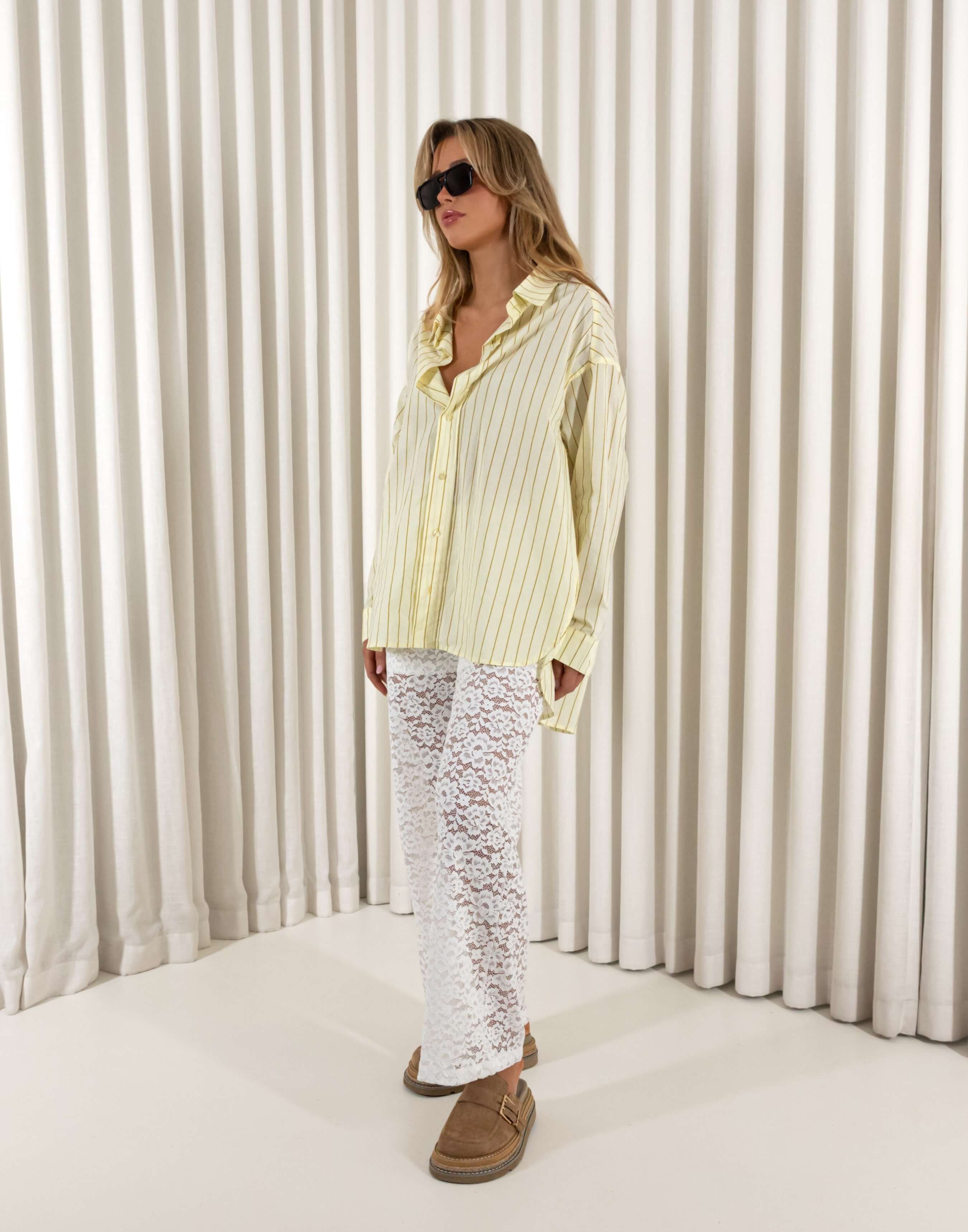 Cut in breathable cotton with an oversized drape, Alex looks fresh and effortless. The relaxed fit skims rather than clings, and the pleated back details adds movement without bulk. Style it half tucked with denim, layered over a tank with lace bottoms or buttoned to the collar with tailored pants. It slips between brunch, office Fridays and late drinks without missing a beat. Practical bits are sorted: a classic button up front for easy wear, long sleeves for coverage, and a bra friendly collared neckline that keeps layering fuss free.