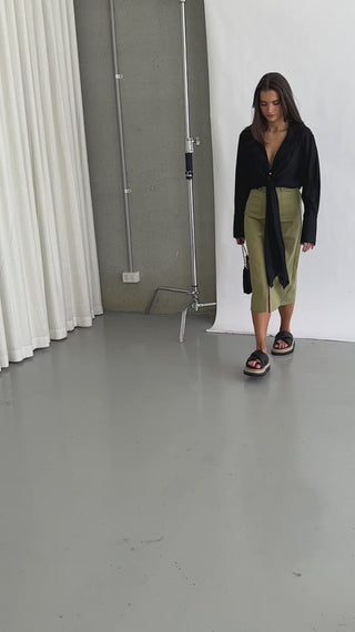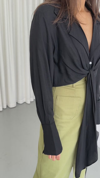 The Brittany Crop is a collared crop with a lapel, button-down close and tie front. It has long sleeves and a button cuff.