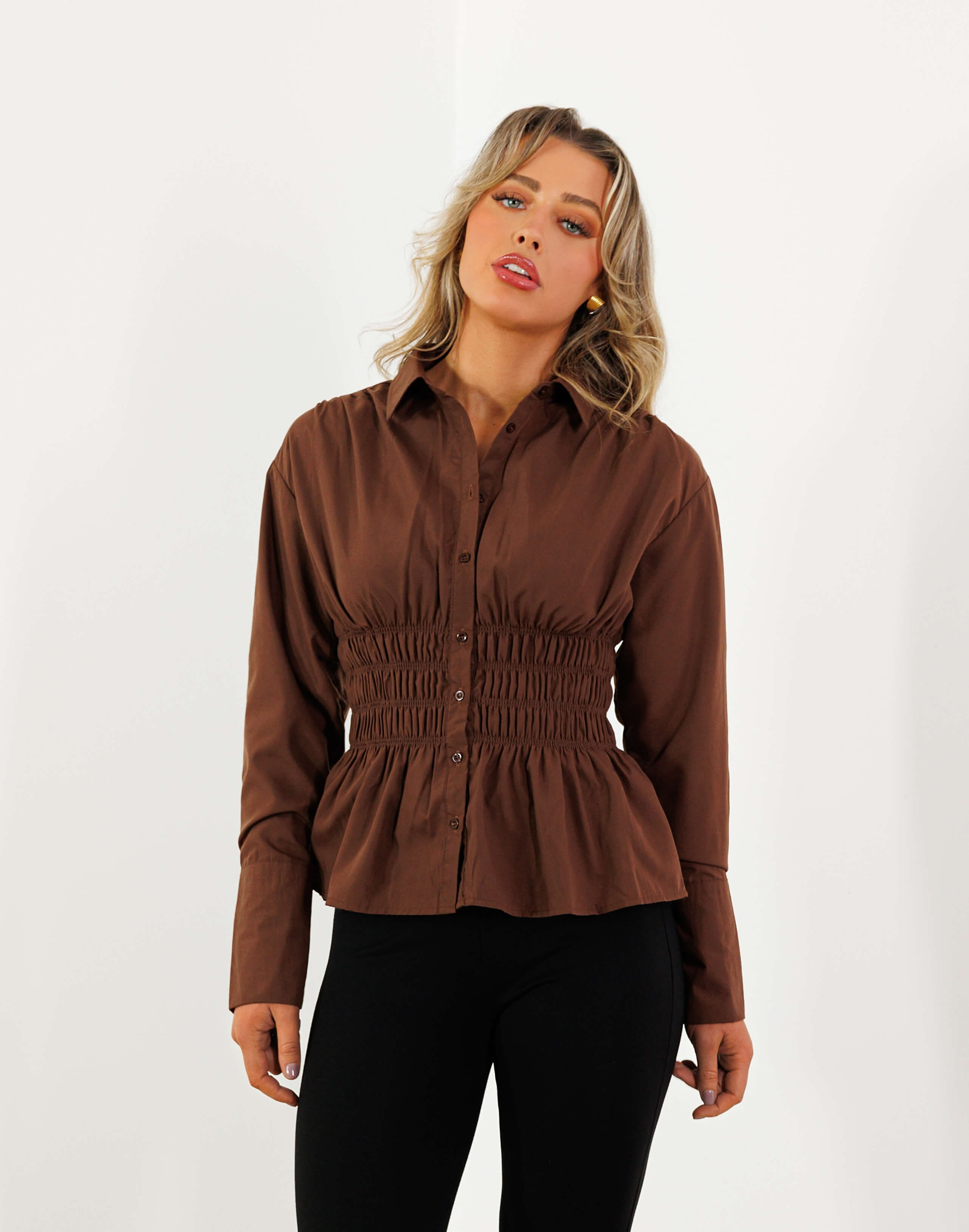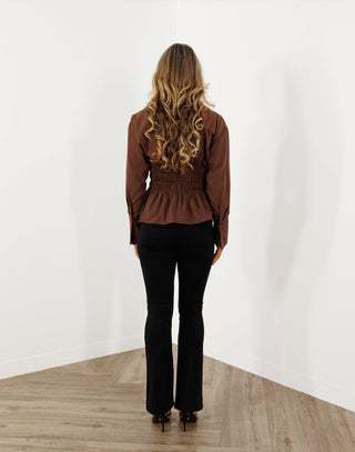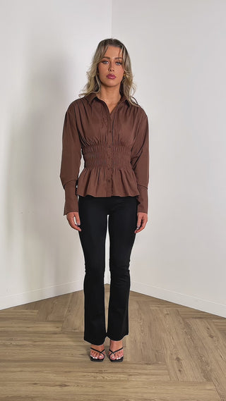Connie Shirt - Collared Button Up Frill Hem - Brown