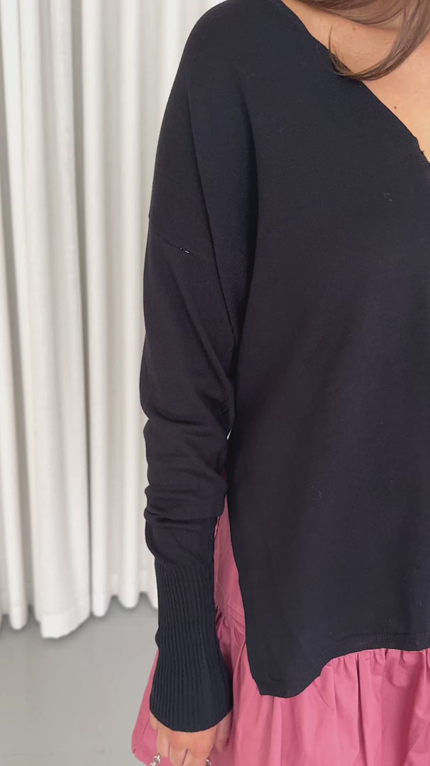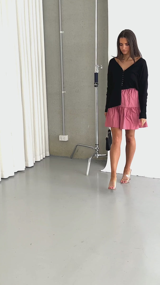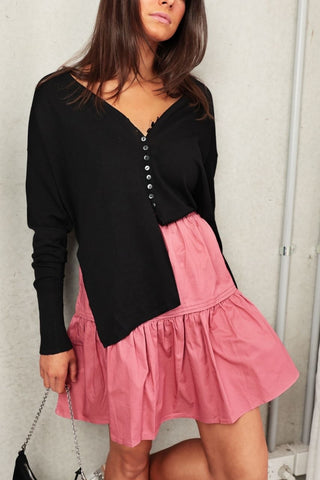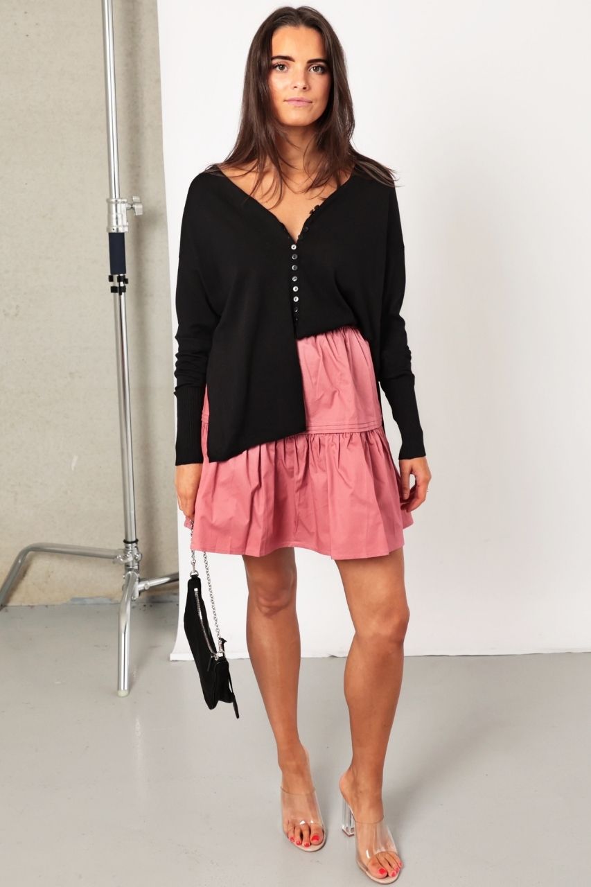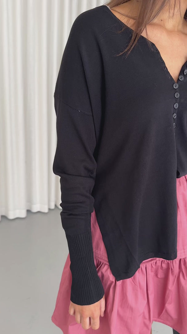 The Gaffney Top has a wide, neckline with a full button-down front and high side splits. It has long fitted sleeves.