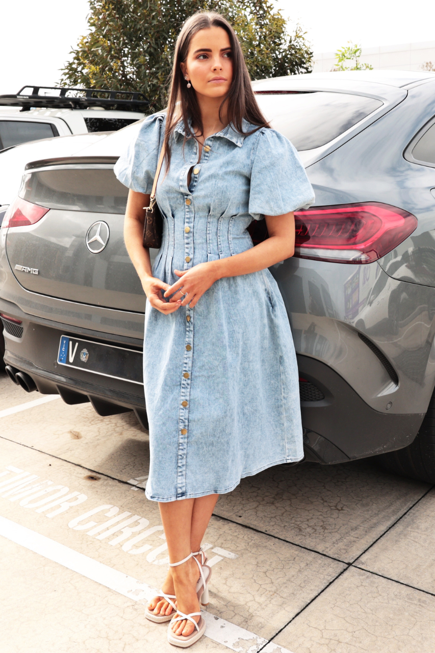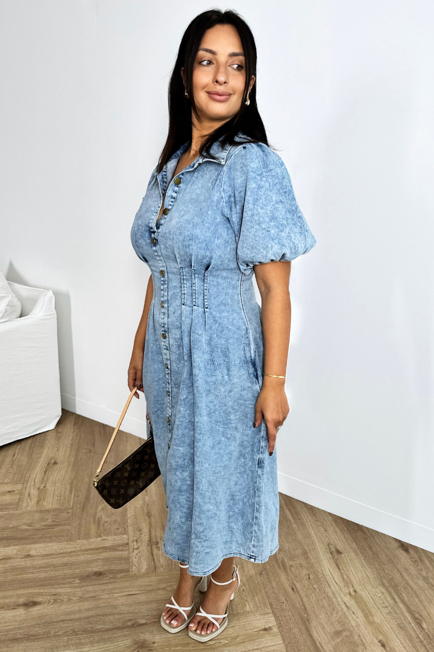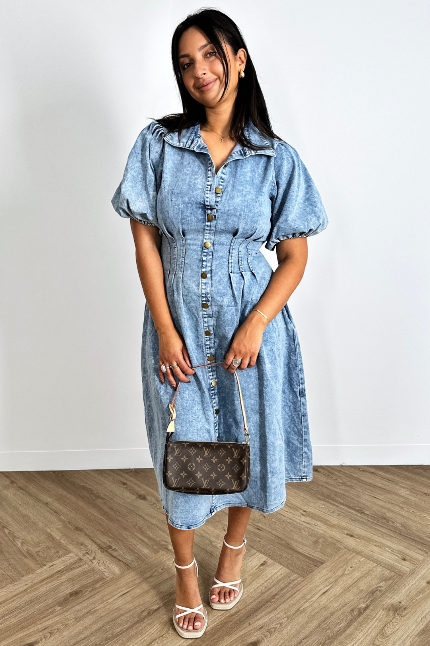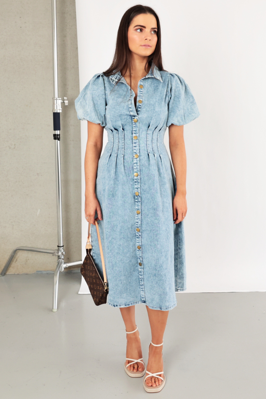 The Marie Dress has a collared neckline and short puff sleeves. It has some functioning buttons at the top and then a faux button down the rest of the front.