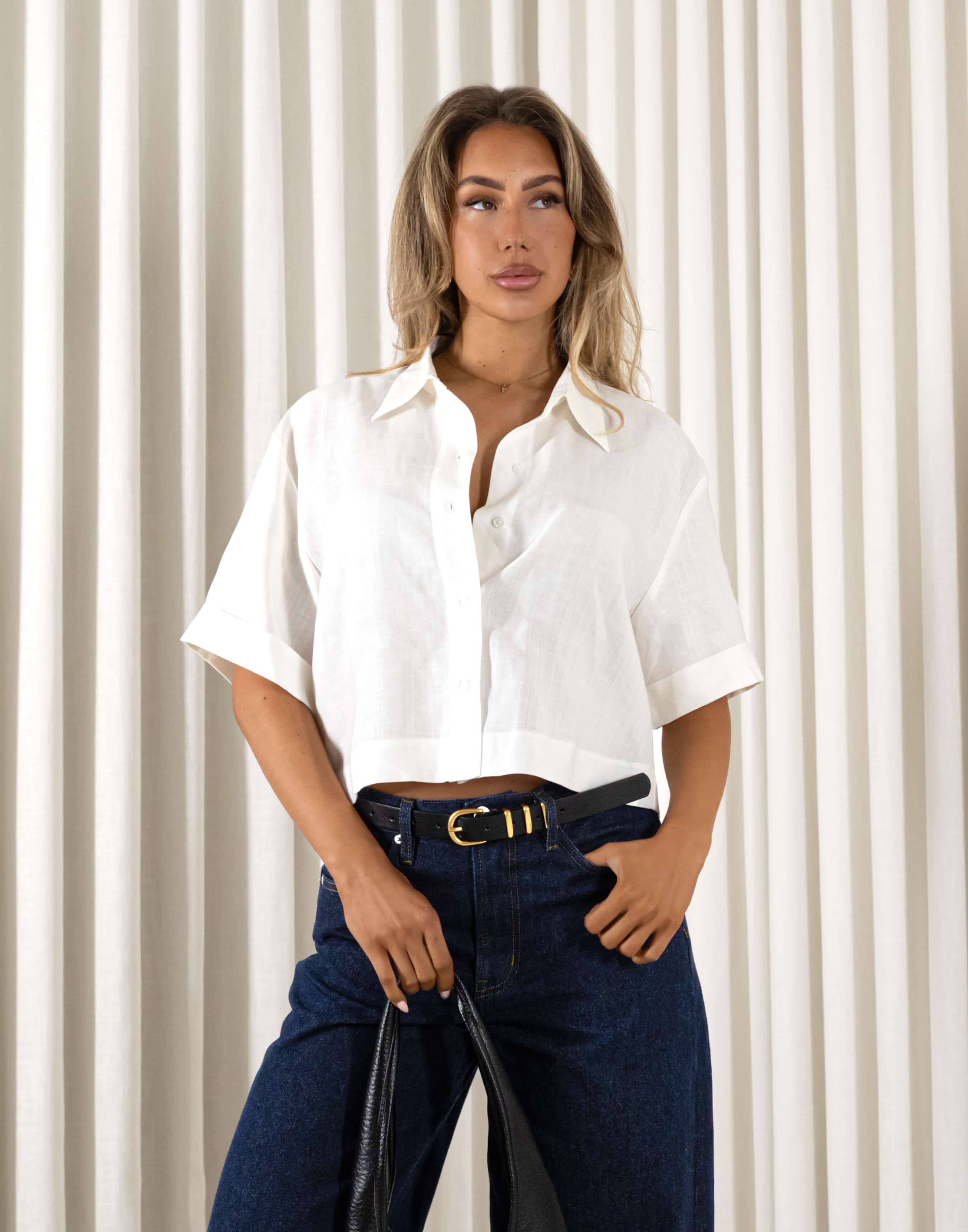 Cut in breathable linen with a relaxed fall, Ollie brings crisp polish without the effort. The collared neckline, short sleeves and easy drape keep it cool and comfortable for brunch runs, winery days and everything in between. Style it un-tucked with denim or layer open over a rib tank and wide-leg pants. Practical details are sorted: a button-up front for simple wear, bra-friendly coverage for fuss-free layering, and a versatile white that plays with your whole wardrobe.
