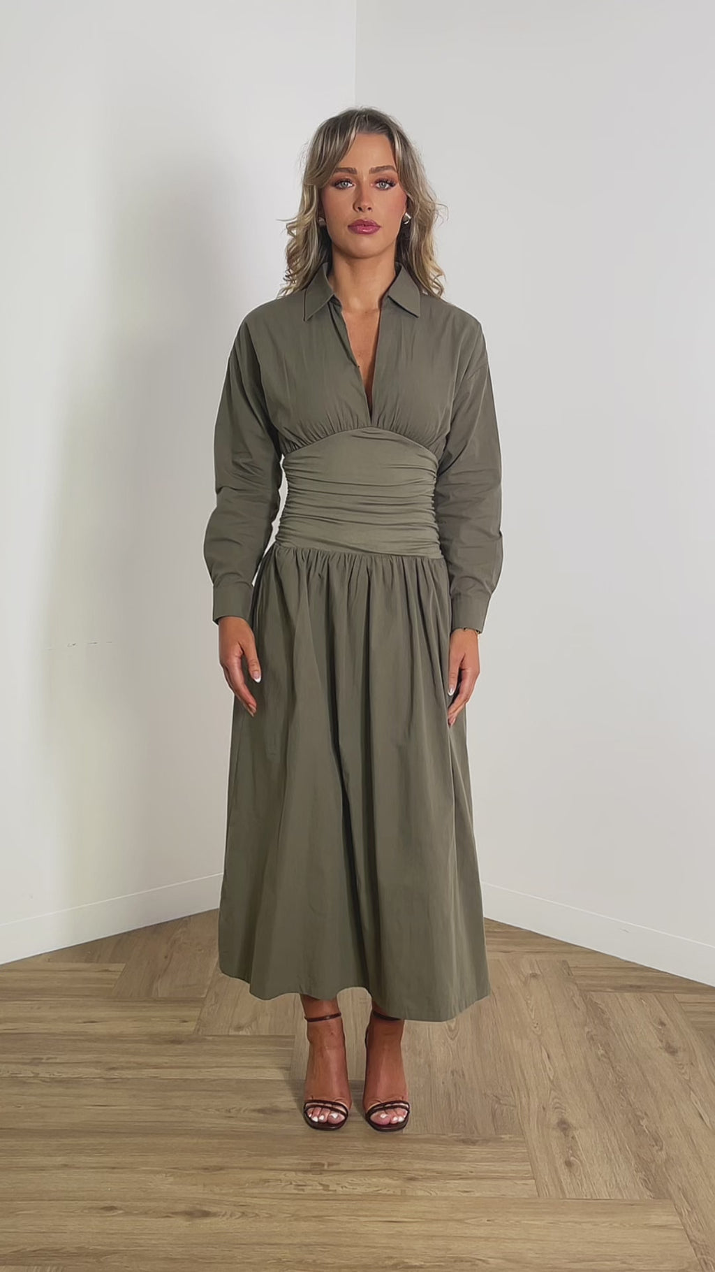 Rita Dress - Cotton Blend Collared Long Sleeve Midi - Green