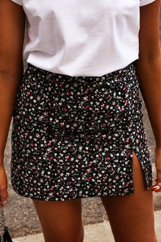 The Roberto Skirt is a gathered, floral mini skirt with a small split at the thigh. It has a hidden zip at centre back for easy entry. With the black base and simple floral pattern this skirt will go back with all the tops you have in your wardrobe.