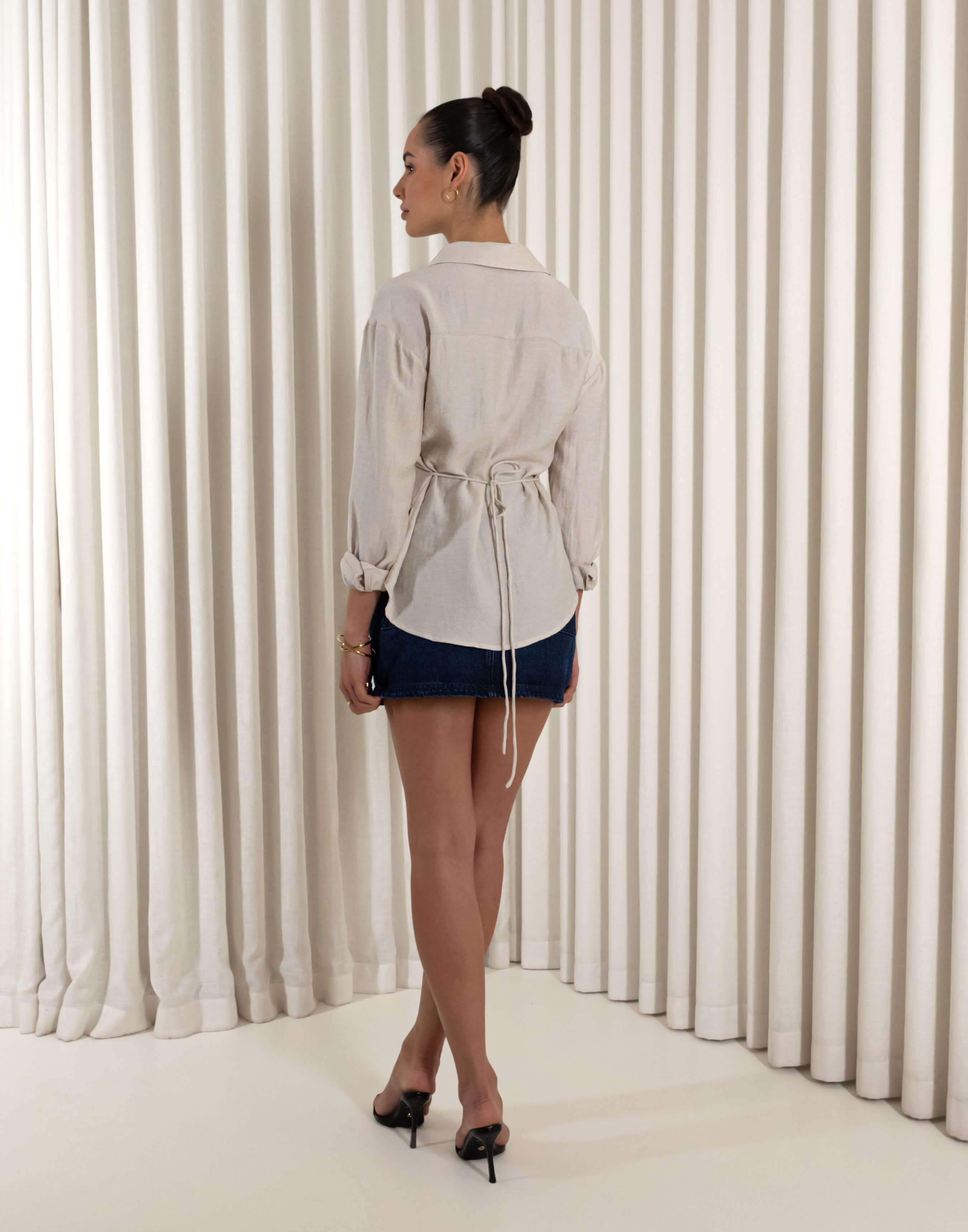Light layers for brunches or a casual date, Stacey keeps things effortless and polished. The linen blend fabric drapes with an easy relaxed fit, while long sleeves and a collared shape add structure. Use the fabric tie to define the waist, or wear it loose over jeans or a denim skirt. Practical touches are sorted: a clean button up front for simple dressing and bra friendly coverage that makes layering painless.